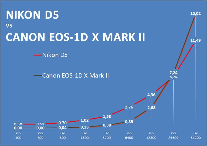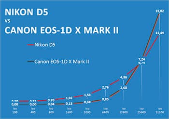 - Уровень шума у Canon чуть растет и доходит до 1,3 балла. Уровень шума Nikon D5 чуть падает — до той же отметки 1,3 балла.