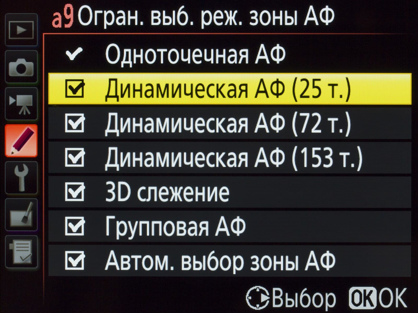 | Автофокус | 61 точка (41 кросс) −2 до +18 EV | 61 точка (41 кросс) −2 до +18 EV | 61 точка (41 кросс) −3 до +18 EV | 51 точка (15 кросс) −2 до +19 EV | 153 точки (99 кросс) −4 до +19 EV |