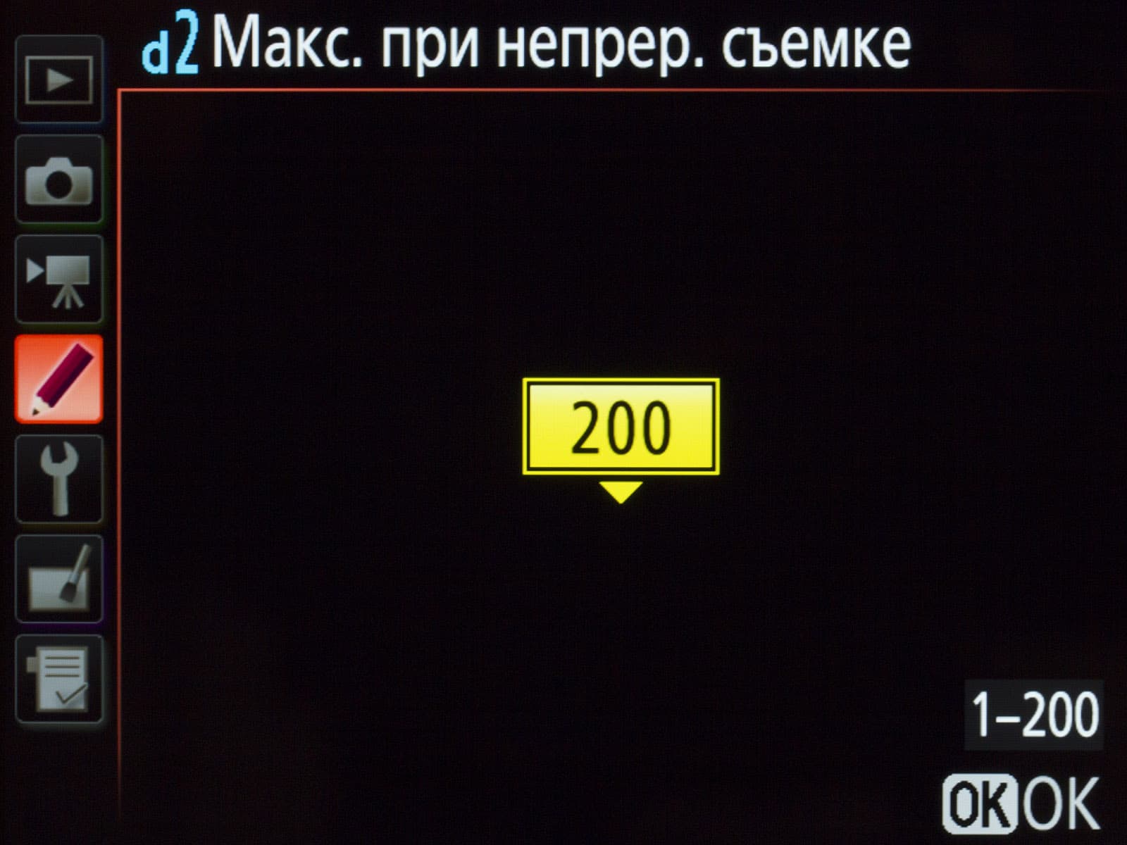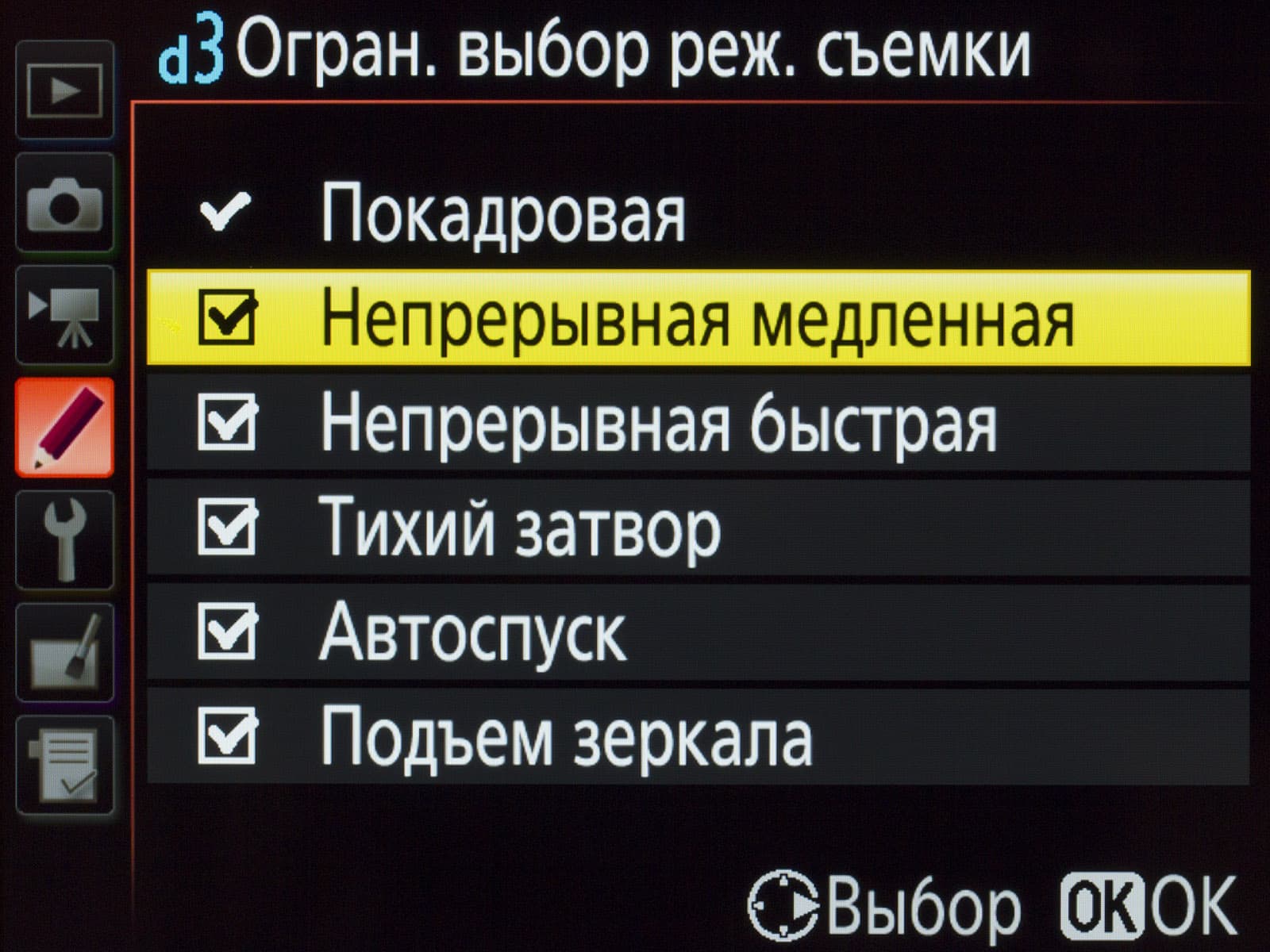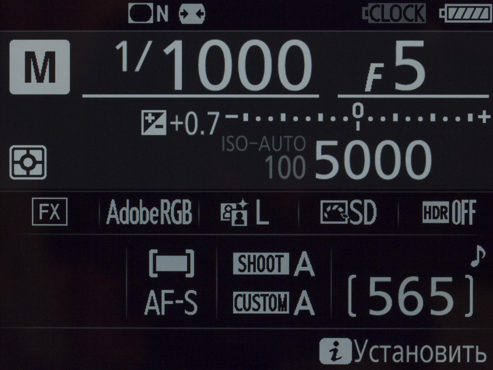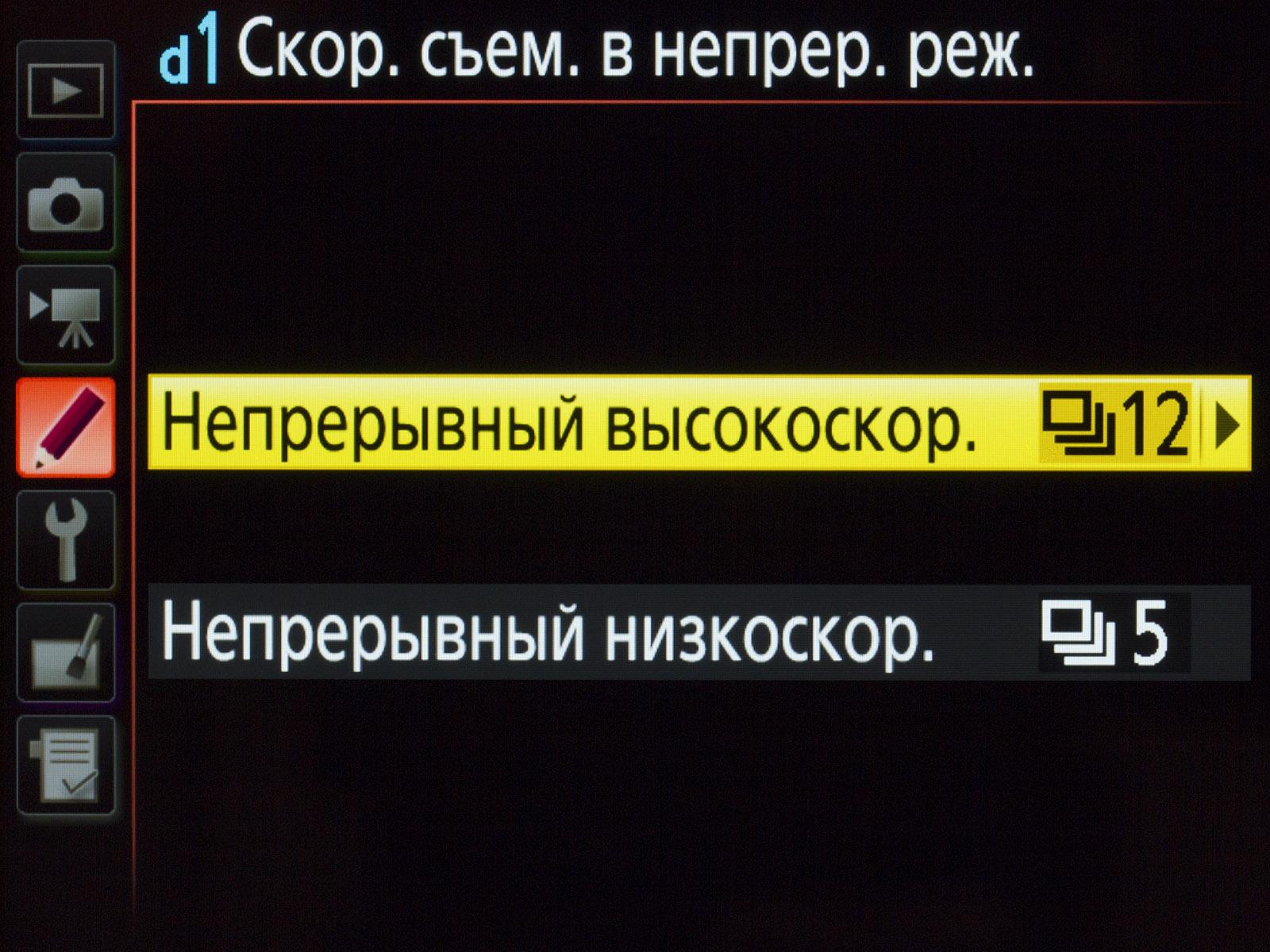 По умолчанию Nikon D5 устанавливает скорость медленной съемки 5 кадров в секунду. Максимальная скорость быстрой съемки — 14 fps, но с поднятым зеркалом (то есть со «слепым» видоискателем и автофокусом). Поэтому мы выбрали максимальную скорость быстрой съемки 12 fps — на этой скорости Nikon D5 может полноценно отслеживать перемещения объекта съемки.