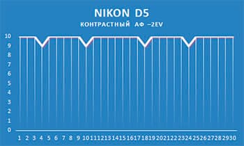 Контрастный автофокус, разумеется, обладает такой же высокой точностью (выше некуда), но гораздо менее высокой скоростью. При освещенности −1EV тест прошел за 57,1 секунды (у флагмана Canon — 51,8 секунды), при освещенности −2EV — за 60 секунд (у флагмана Canon — 57,8 секунды). Здесь мы видим существенную разницу во времени, так можем сказать, что контрастный АФ Nikon D5 работает чуть медленнее, чем гибридный АФ Canon EOS-1D X Mark II. Немного, но уступает по скорости.