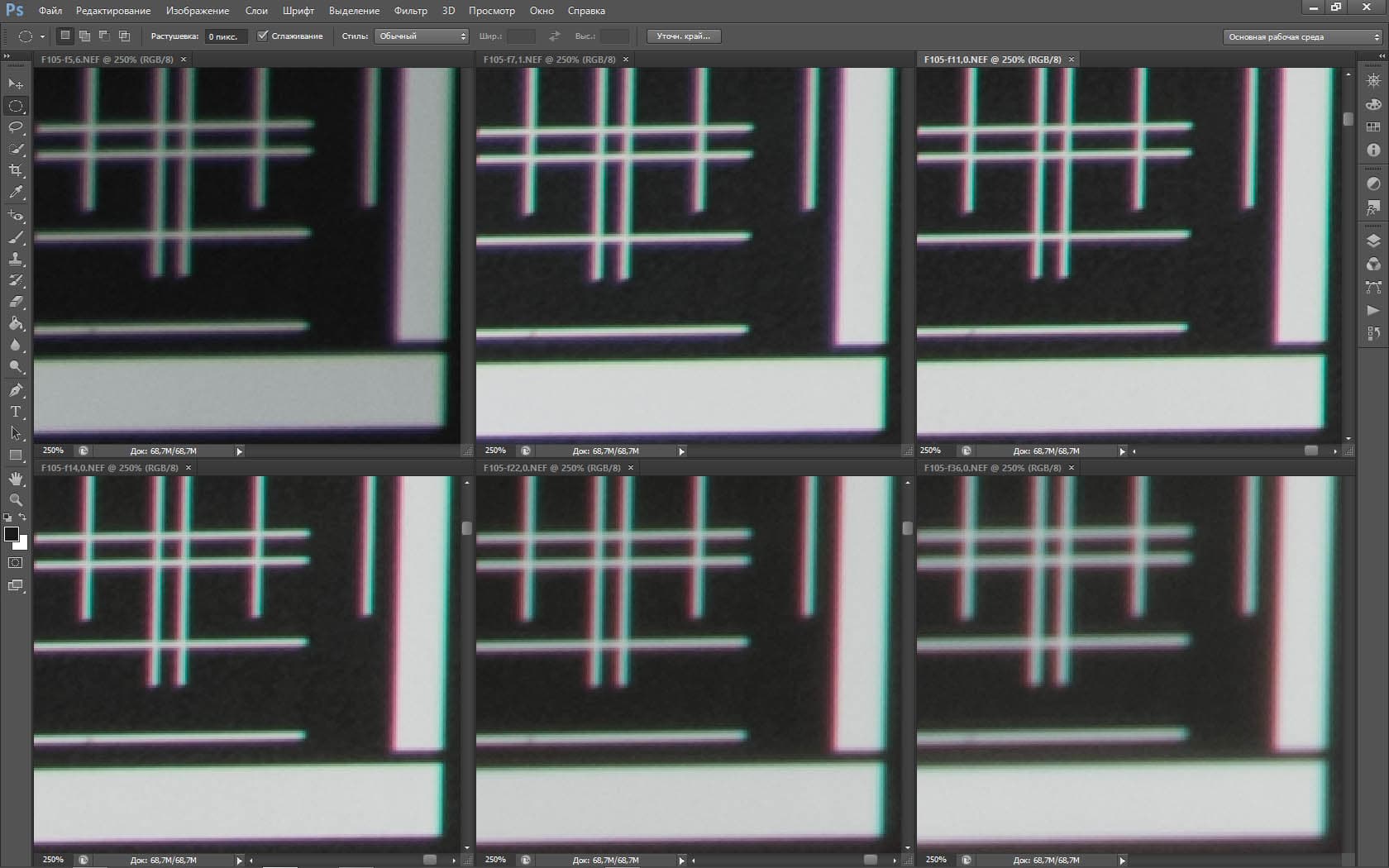 | На всех скриншотах: верхний ряд: f/5,6 — f/7,1 — f/11, нижний ряд: f/14 — f/22 — f/36 | |||