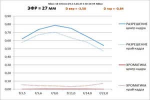 - Геометрические искажения остаются на приемлемом уровне, а разрешение — на высоком на широкой диафрагме и не опускается ниже 0,6 линии на пиксель, пока диафрагма не уменьшается до f/20 – f/22.