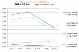 - А уровень хроматических аберраций продолжает оставаться очень высоким. В центре кадра по мере закрытия диафрагмы он растет от 5 до 10 процентов, на краю — от 10 до 20. То есть мы наблюдаем очень сильную «хроматику».