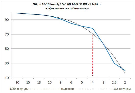 Методика тестирования стабилизатора подробно описана в статье о Nikon D5300. По нашей оценке, стабилизатор Nikon 18-105mm f/3.5-5.6G AF-S ED DX VR Nikkor эффективно работает на выдержке 1/4 секунды. Это дает фотографу приблизительно 3,7 дополнительные ступени.