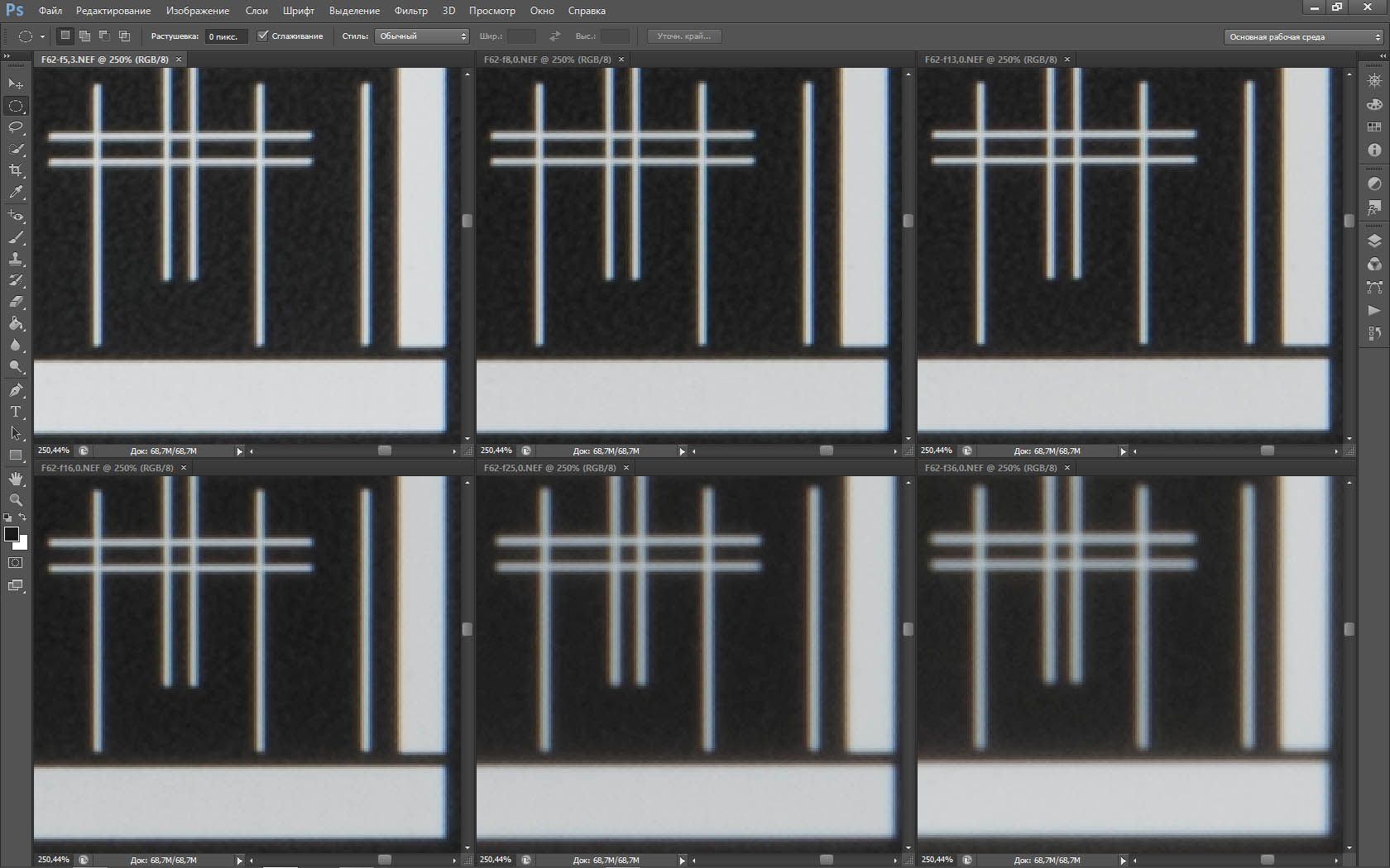 | На всех скриншотах: верхний ряд: f/5,3 — f/8 — f/13, нижний ряд: f/16 — f/25 — f/36 | |||
