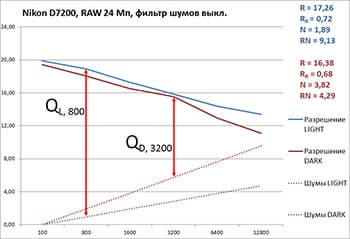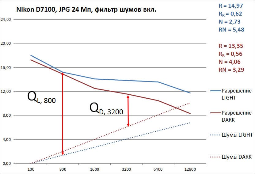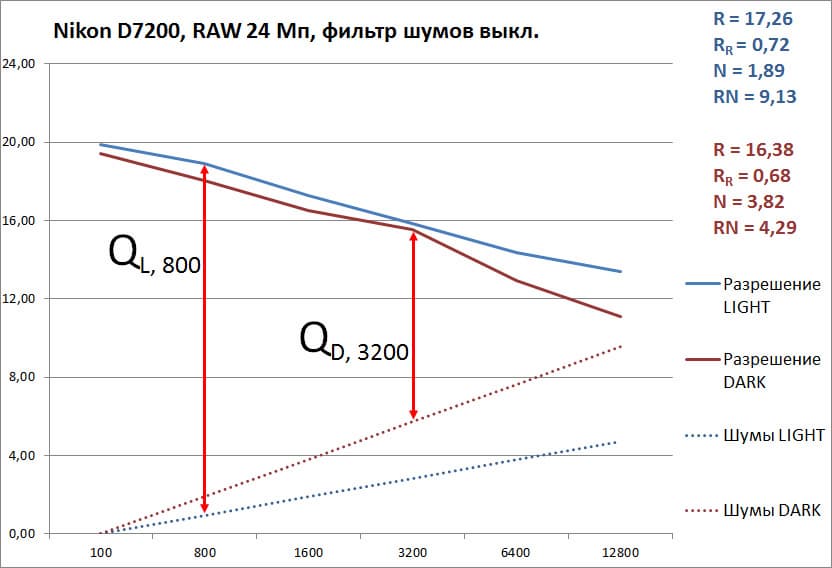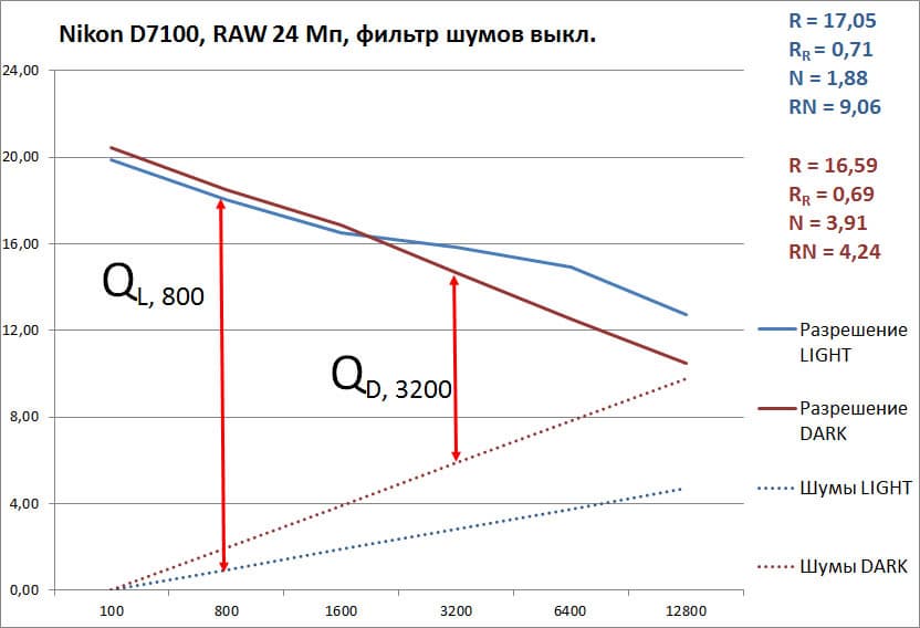 Шумы, конечно, не измеряются в мегапикселях, они измеряются в собственных единицах или баллах, но для наглядности их можно нанести на график разрешения. Мы обработали сотни тестовых снимков и пришли в выводу, что качество изображения тесно связано с расстоянием между кривыми разрешения и шумов. Там где кривые сходятся, о качестве можно не говорить — картинка буквально утопает в шумах.