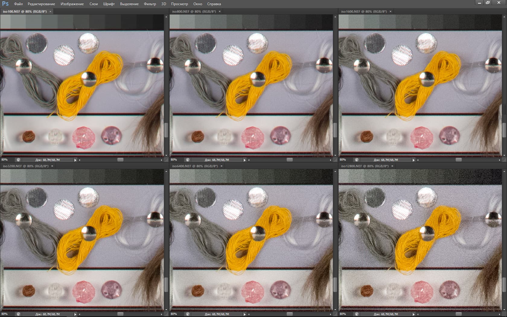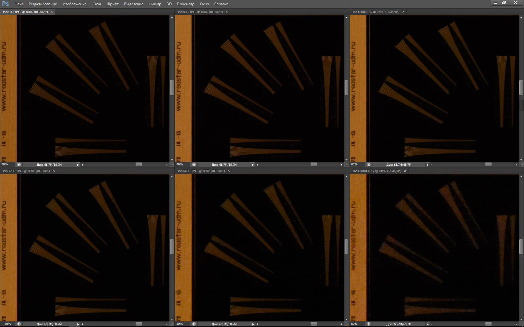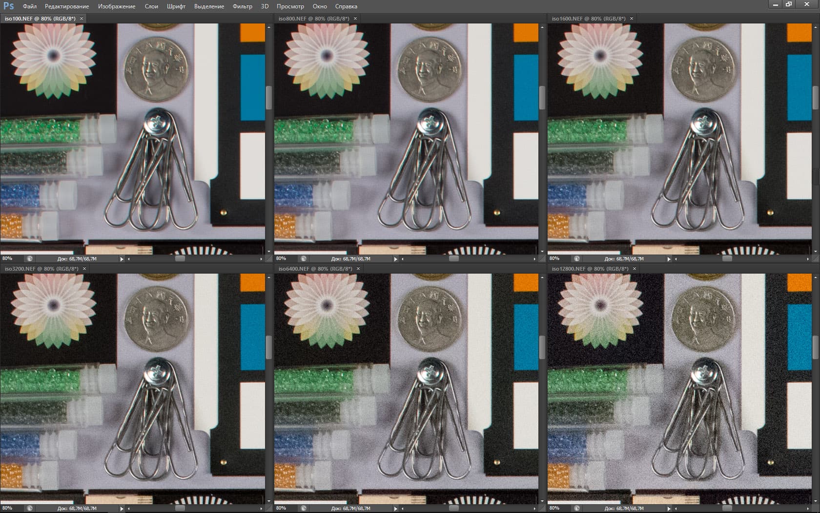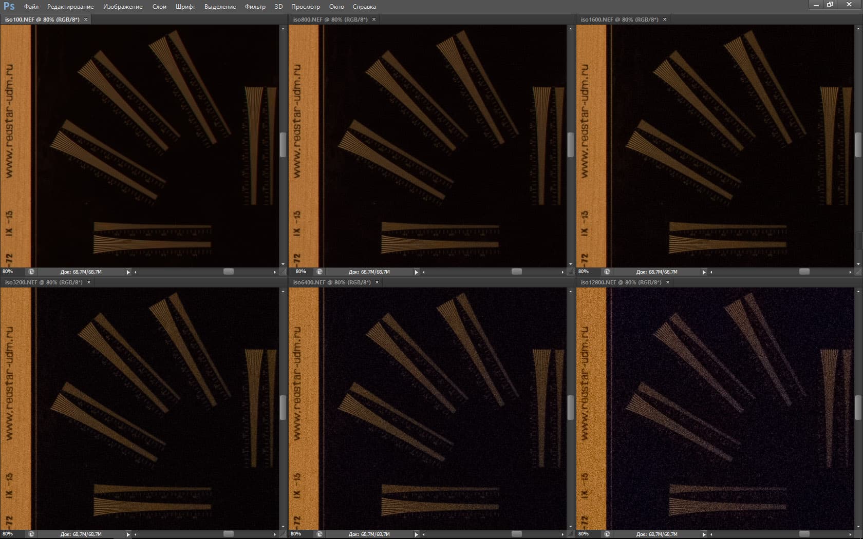 Эти различия видны даже на ISO 800, а по мере увеличения чувствительности становятся все более заметными. Мы явно видим, что Nikon D7200 «шумит» меньше. То есть, как нам показали кадры RAW, «шумит» она так же, но борется с шумами более успешно. Правда, уже на чувствительности ISO 3200 мы наблюдаем желтую полоску вдоль горизонтальной черной полосы. На снимке ISO 6400 полоска становится еще более отчетливой, а на ISO 12 800 в кадре появляются желтые пятна. У D7100 желтых пятен нет, но уровень шумов — более высокий.