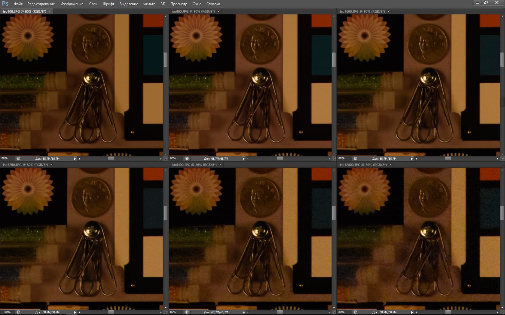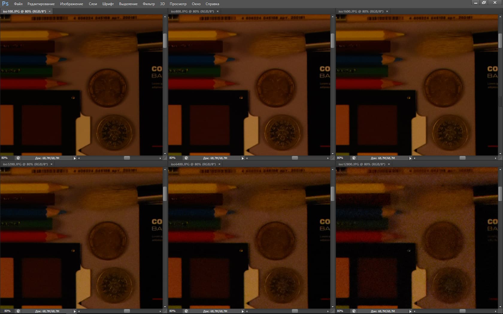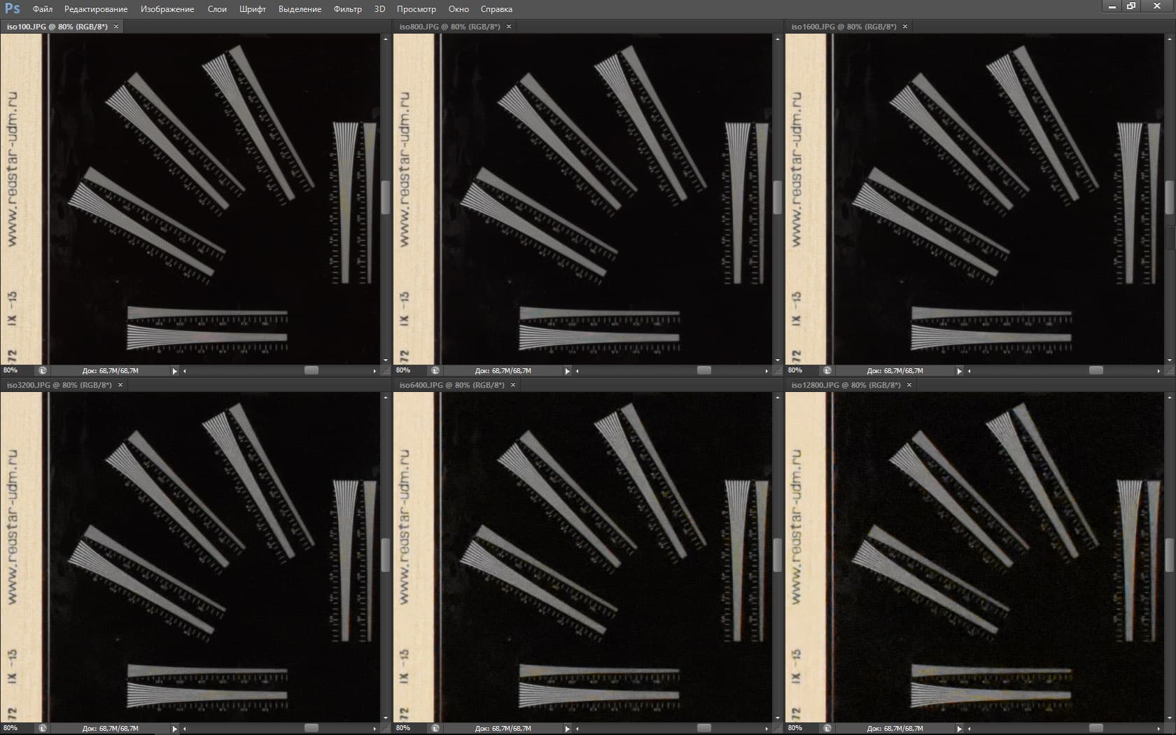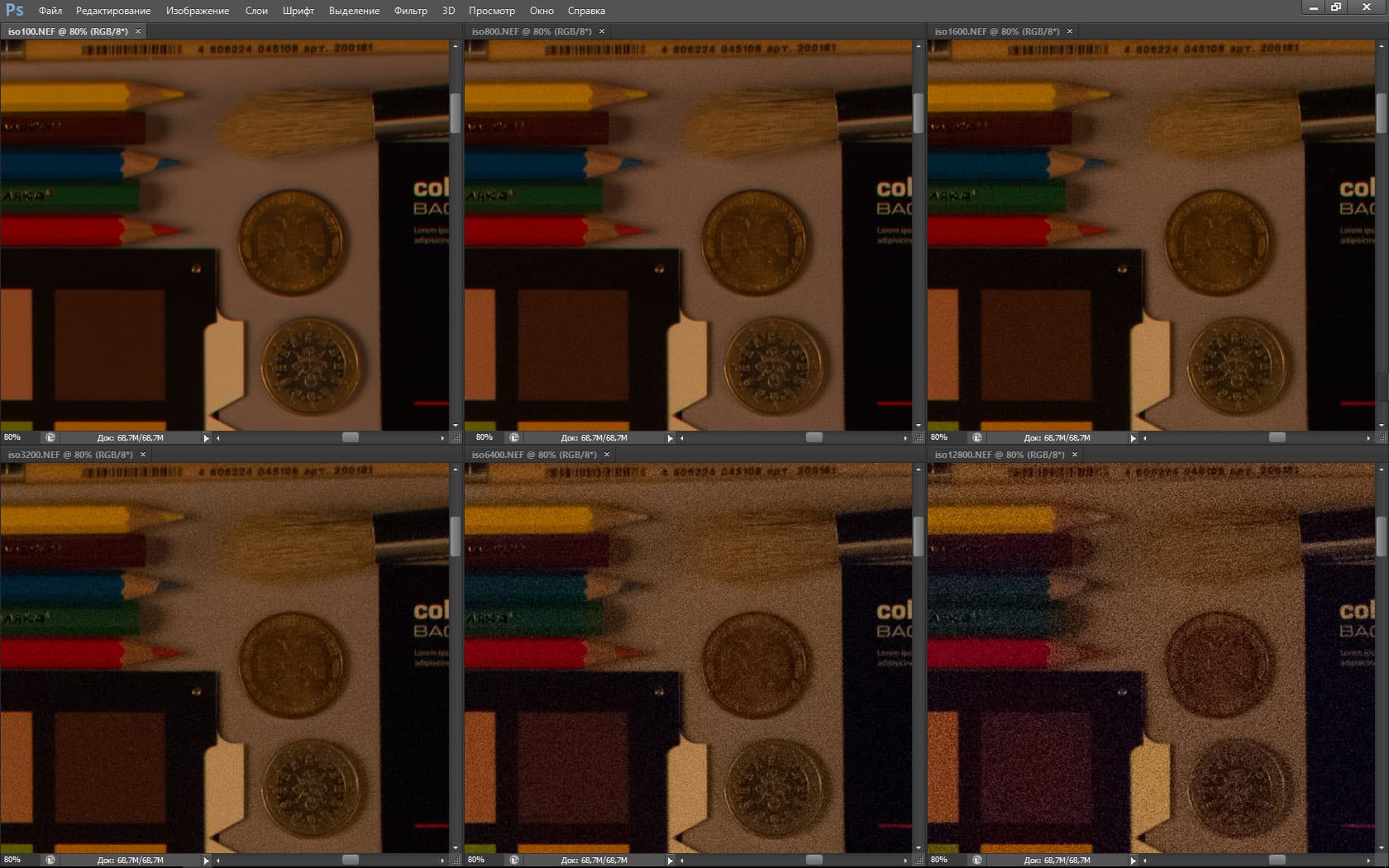 Эти различия видны даже на ISO 800, а по мере увеличения чувствительности становятся все более заметными. Мы явно видим, что Nikon D7200 «шумит» меньше. То есть, как нам показали кадры RAW, «шумит» она так же, но борется с шумами более успешно. Правда, уже на чувствительности ISO 3200 мы наблюдаем желтую полоску вдоль горизонтальной черной полосы. На снимке ISO 6400 полоска становится еще более отчетливой, а на ISO 12 800 в кадре появляются желтые пятна. У D7100 желтых пятен нет, но уровень шумов — более высокий.