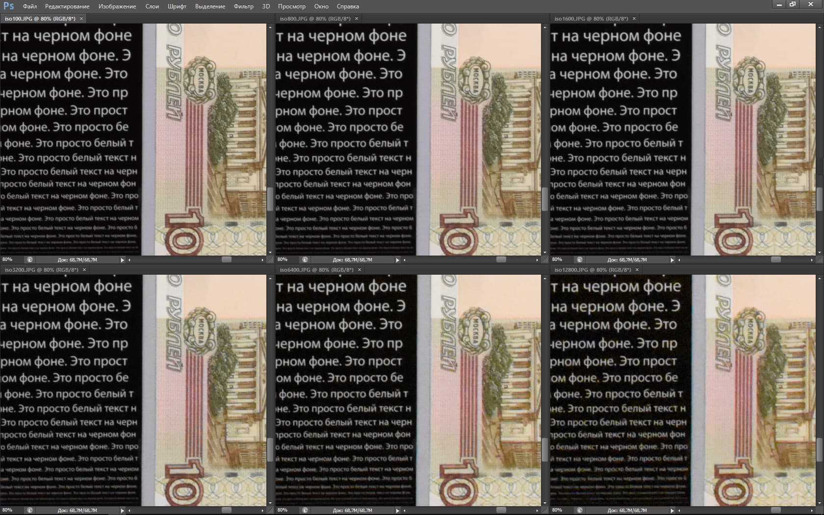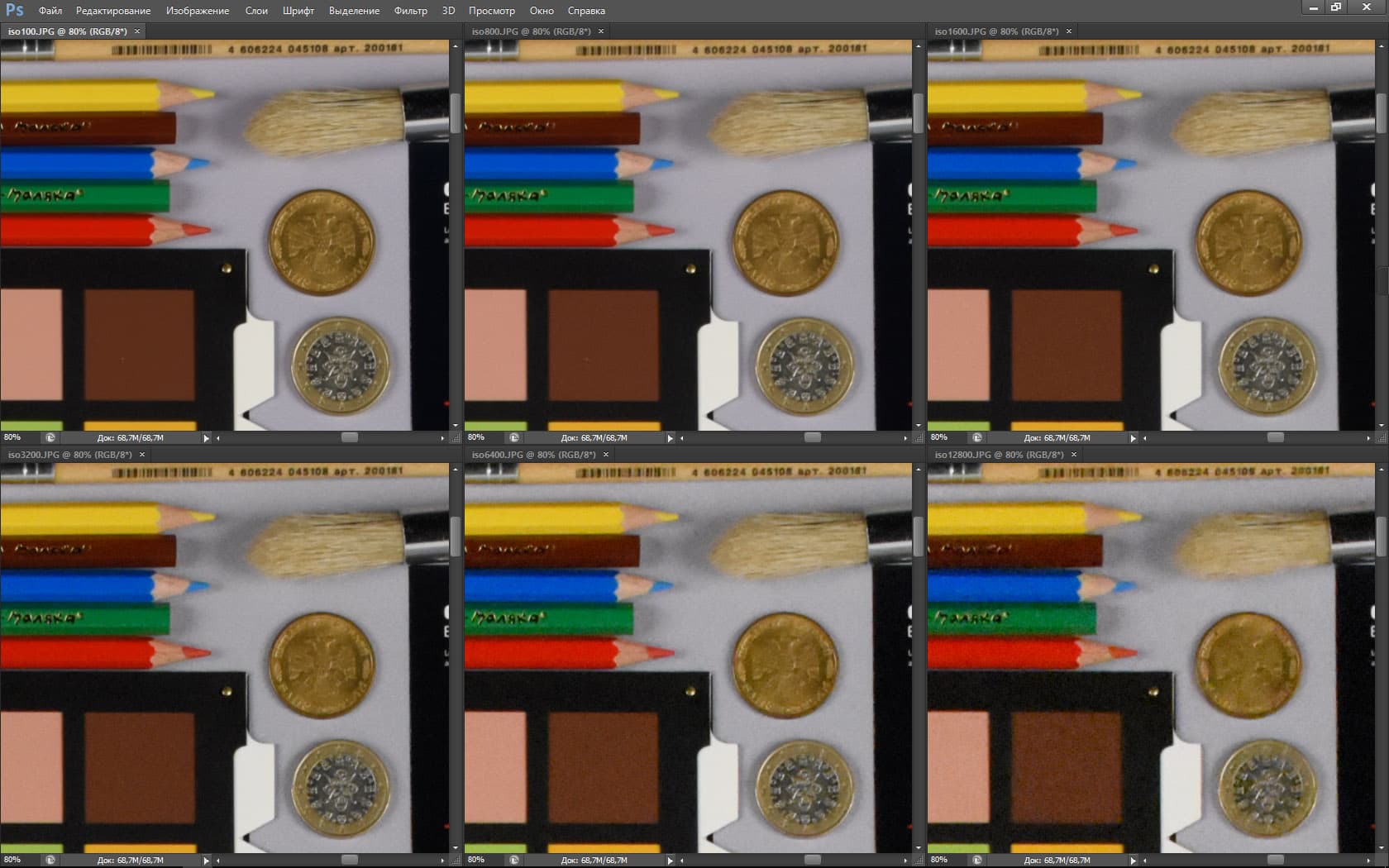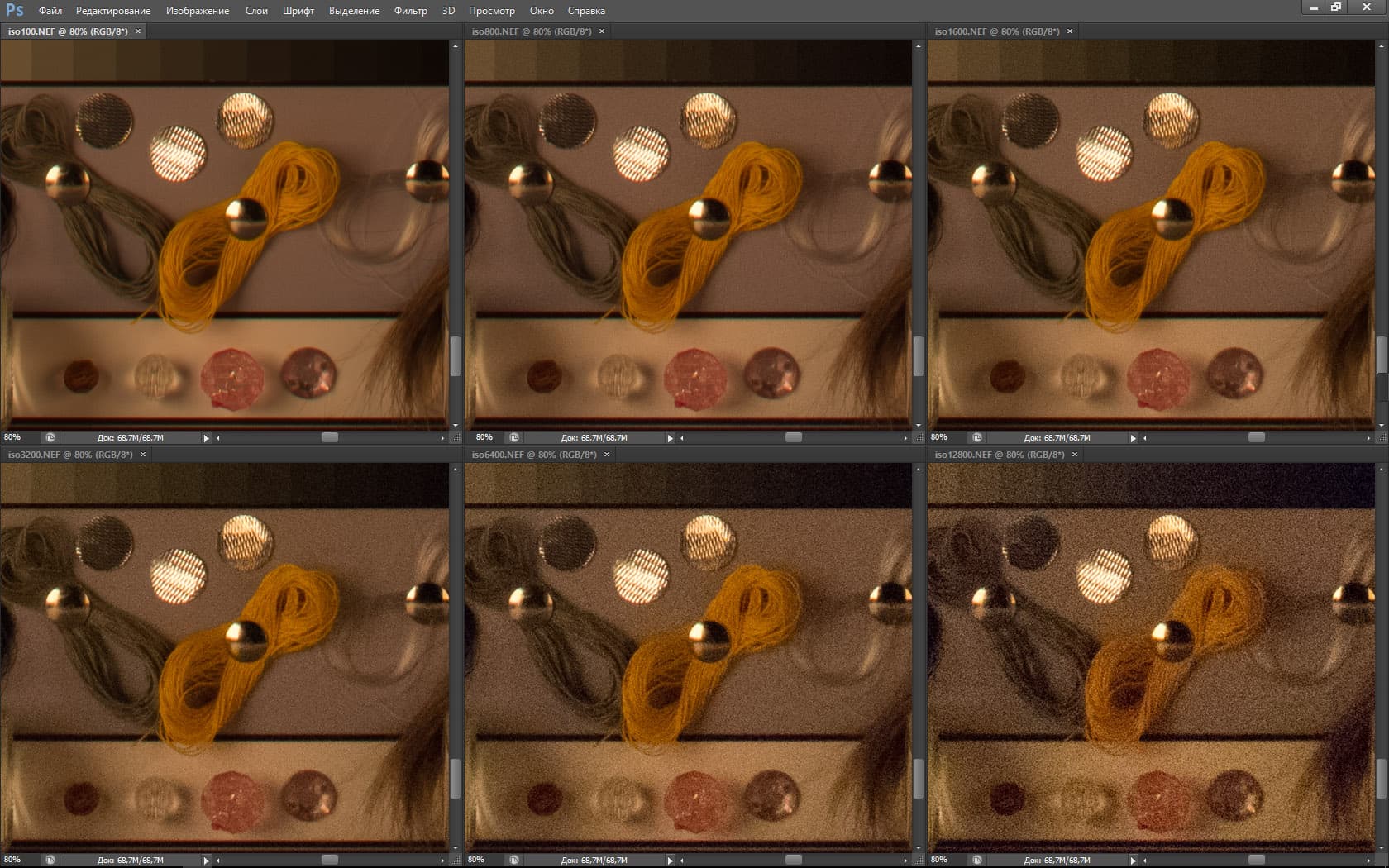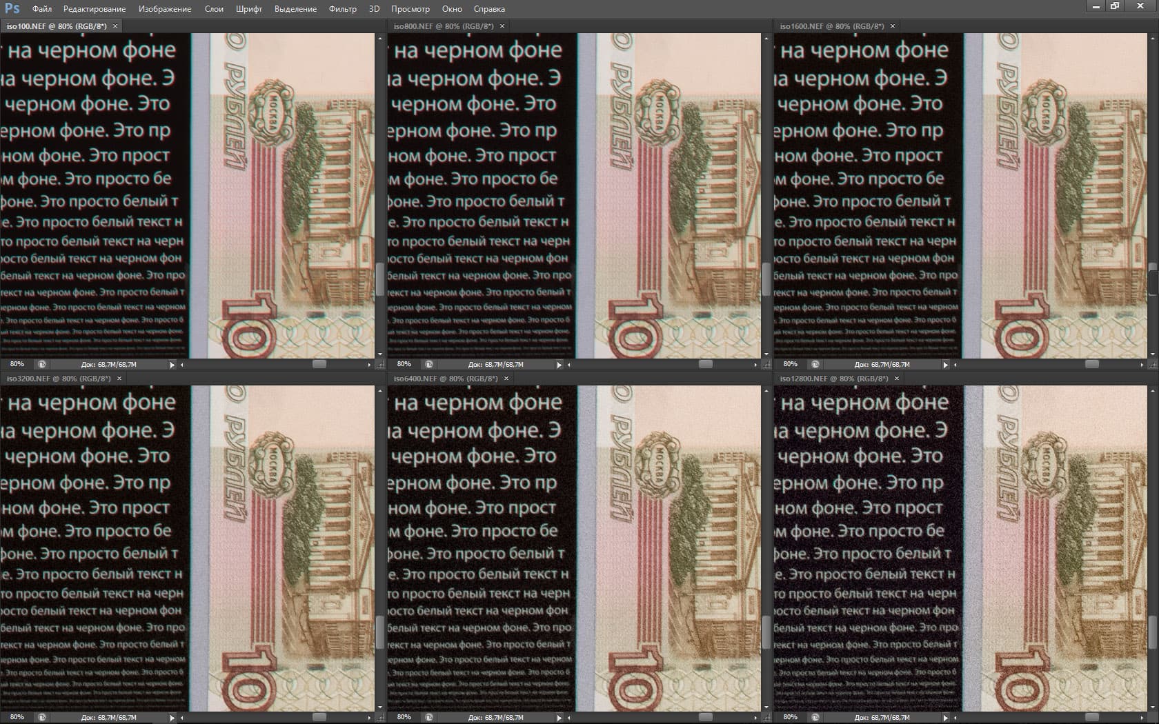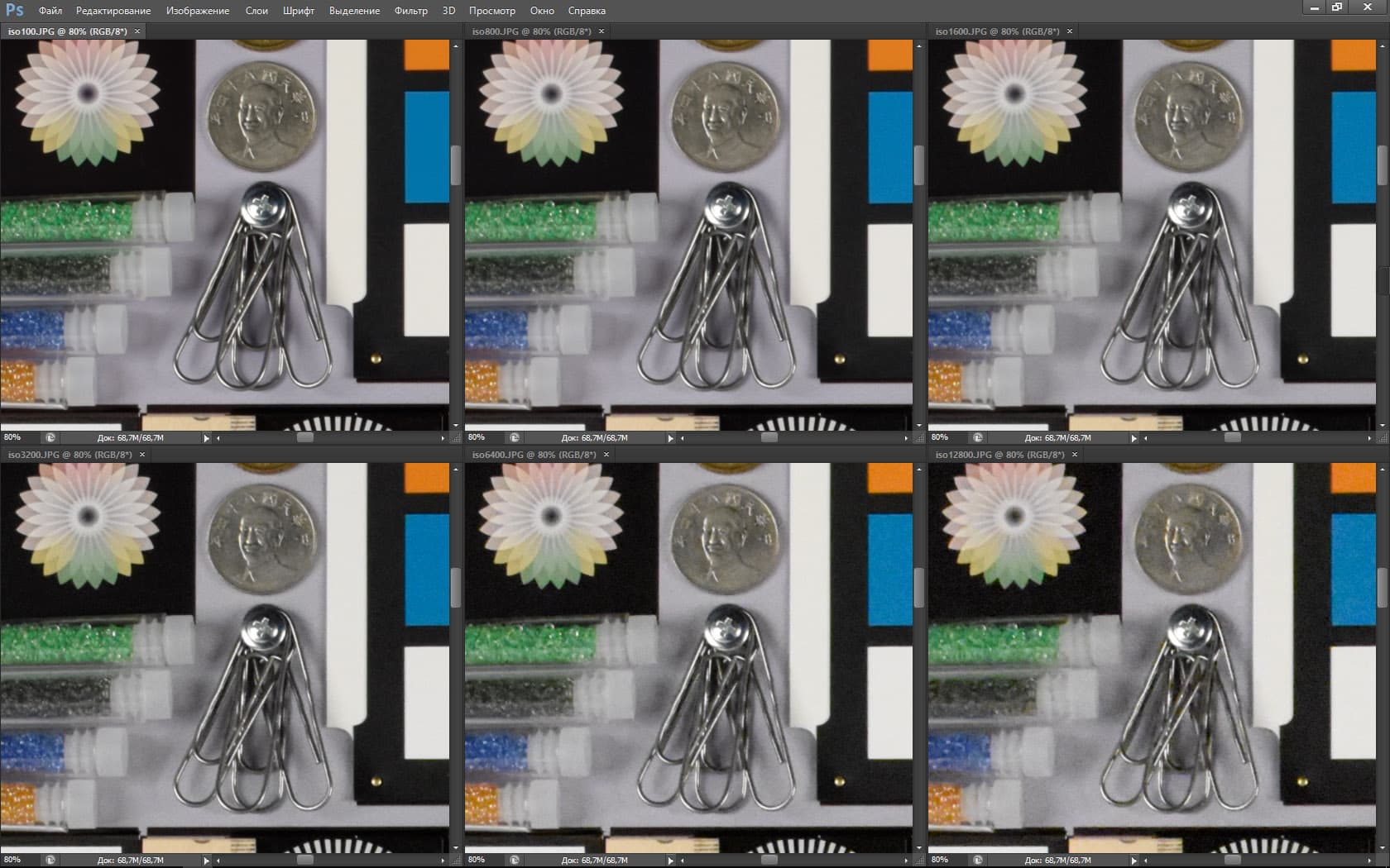Эти различия видны даже на ISO 800, а по мере увеличения чувствительности становятся все более заметными. Мы явно видим, что Nikon D7200 «шумит» меньше. То есть, как нам показали кадры RAW, «шумит» она так же, но борется с шумами более успешно. Правда, уже на чувствительности ISO 3200 мы наблюдаем желтую полоску вдоль горизонтальной черной полосы. На снимке ISO 6400 полоска становится еще более отчетливой, а на ISO 12 800 в кадре появляются желтые пятна. У D7100 желтых пятен нет, но уровень шумов — более высокий.