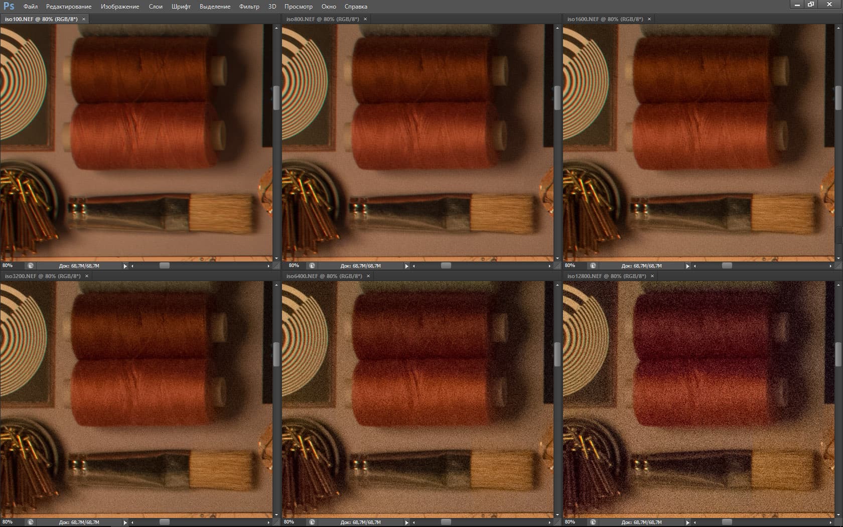 Если внимательно посмотреть семплы, можно подумать, что они просто сделаны одной камерой. По уровню, по характеру шумов, по уровню разрешения сходство такое, что кадры можно перепутать. Без подписей в таблице я бы не взялся сказать, какой кадр сделан Nikon D7100, какой — D7200. И очень похожую картину мы видим, рассматривая семплы, сделанные в темной сцене: