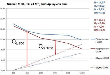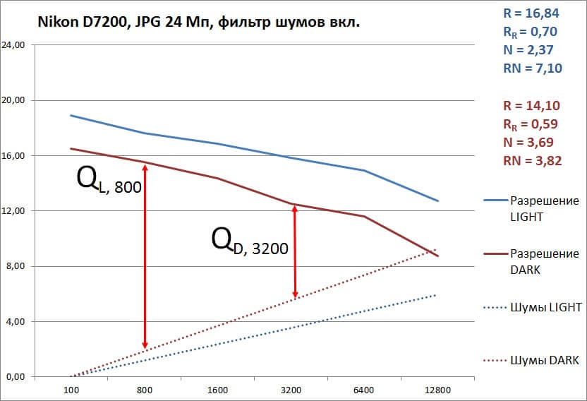 Напомню, что все эти оценки — средние в диапазоне ISO 100 — 6400. И получены они в светлой сцене по тестовым снимкам «JPG с включенным фильтром шумов». Впрочем, если мы перейдем к темной сцене, преимущество D7200 сохранится:
