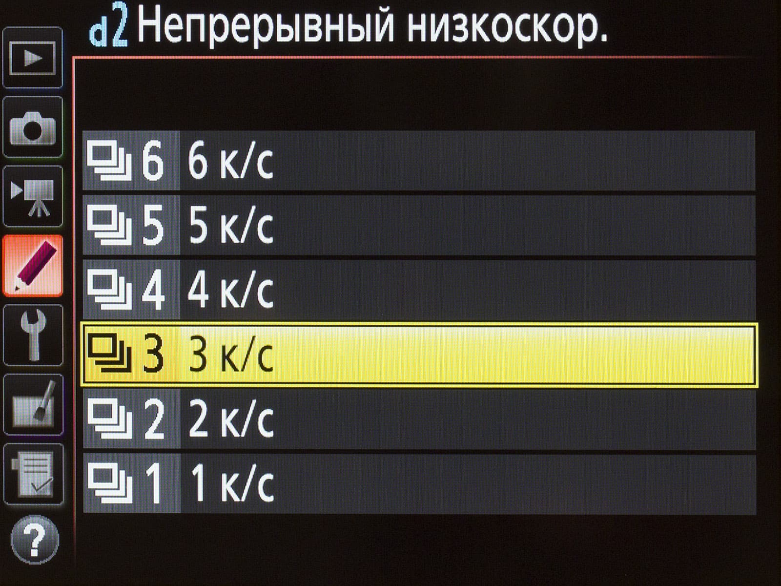 | Low — низкая скорость 6 fps до заполнения буфера | 5,87 fps / ∞ | 4,8 fps / 7 кадров (13 кадров у D7200) | 4,9 fps / 5 кадров (10 кадров у D7200) |