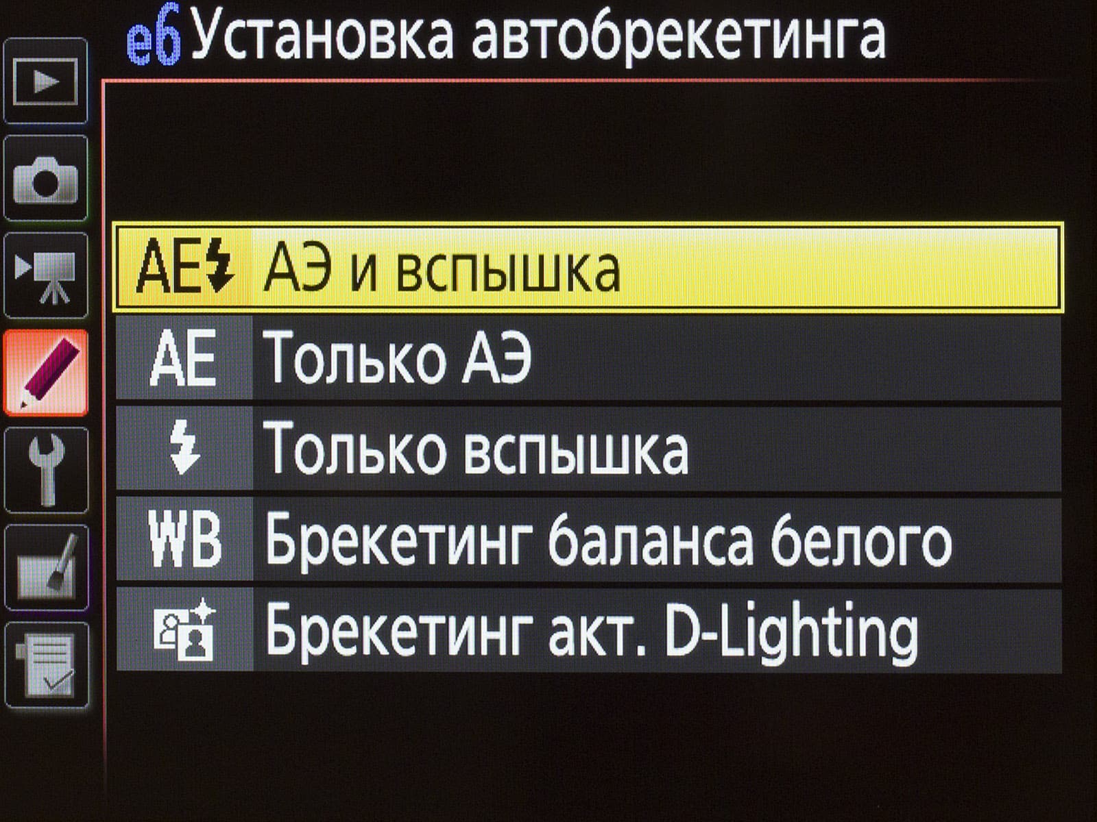 - Возможен одновременный брекетинг экспозиции и вспышки.