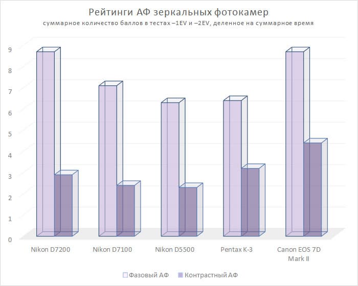 При расчете рейтинга мы не разделяем баллы и время. Рейтинг вычисляется просто — это сумма баллов, набранных в двух испытаниях, деленная на суммарное время, затраченное в двух испытаниях (при освещении −1EV и −2EV). И здесь мы видим, что контрастный АФ Nikon D7200, несмотря на свои редкие промахи (несфокусированные кадры) работает более эффективно, чем контрастный АФ Nikon D7100.