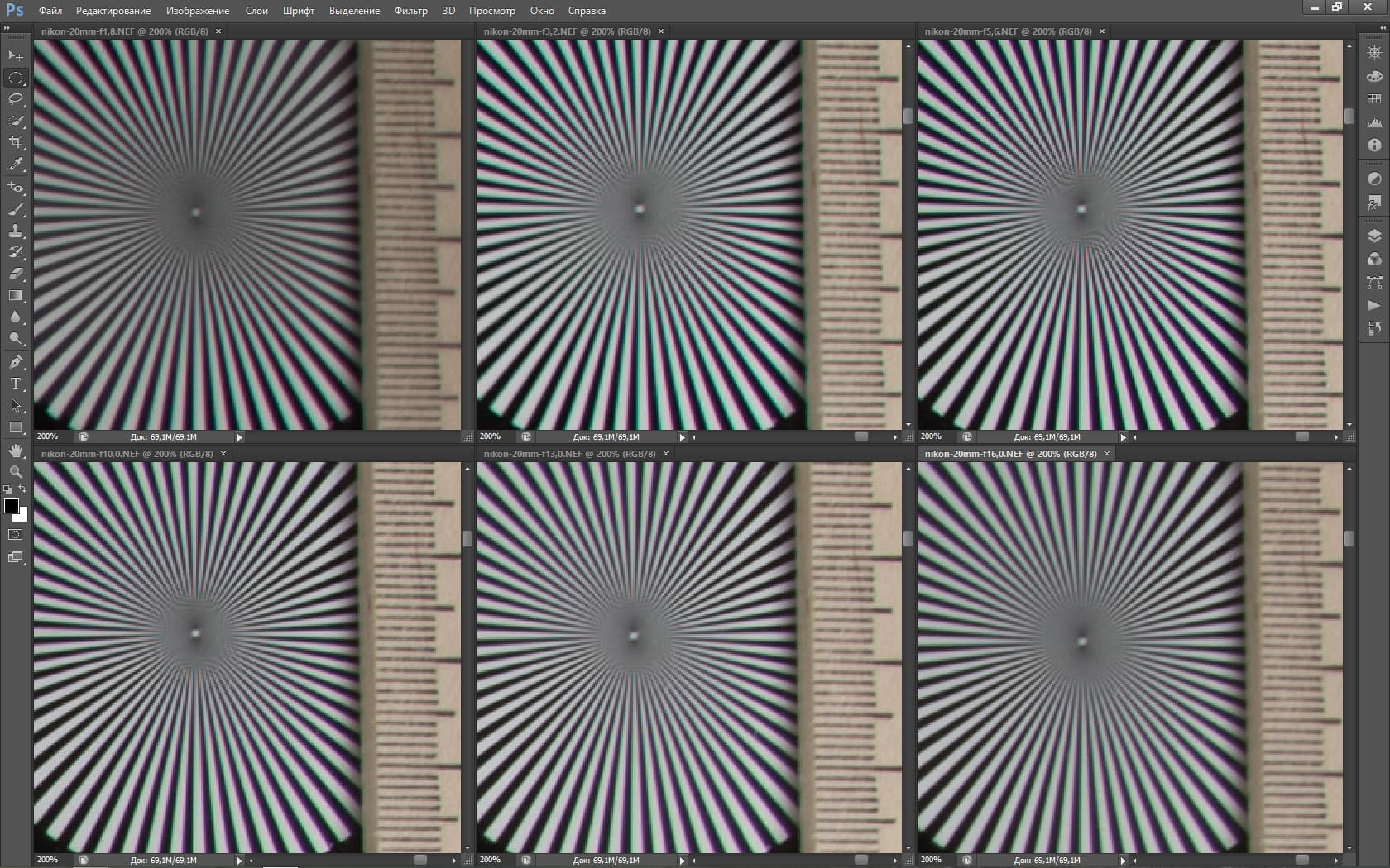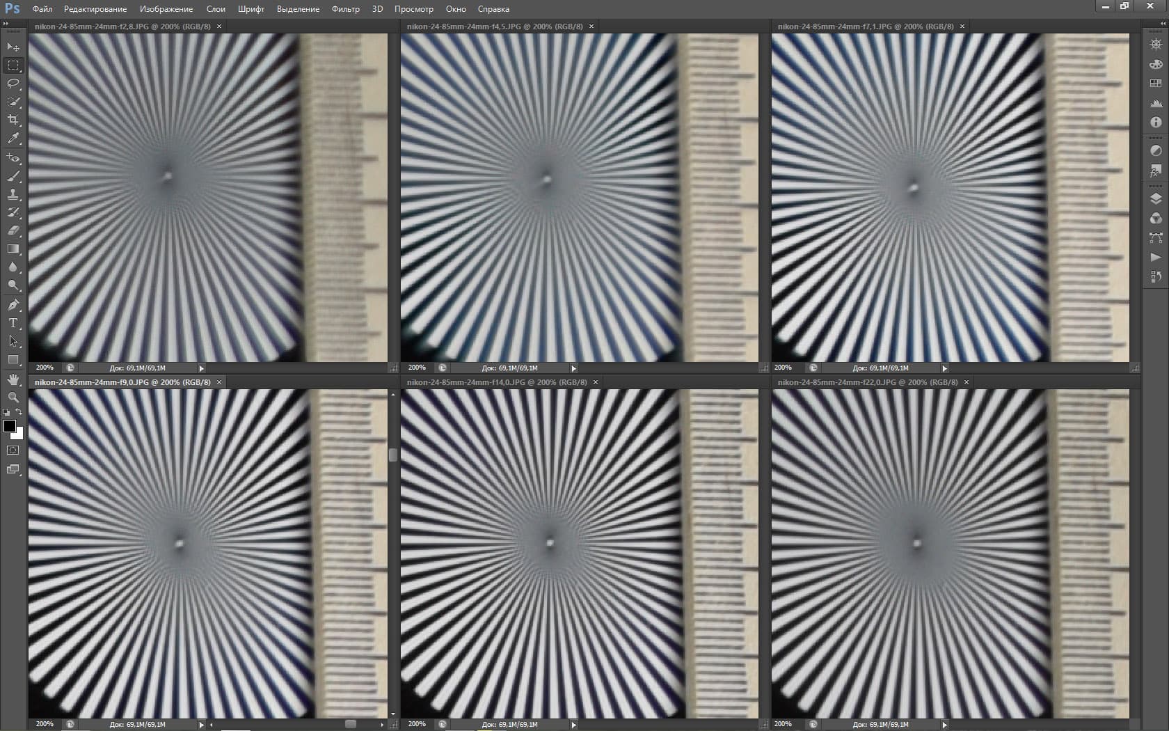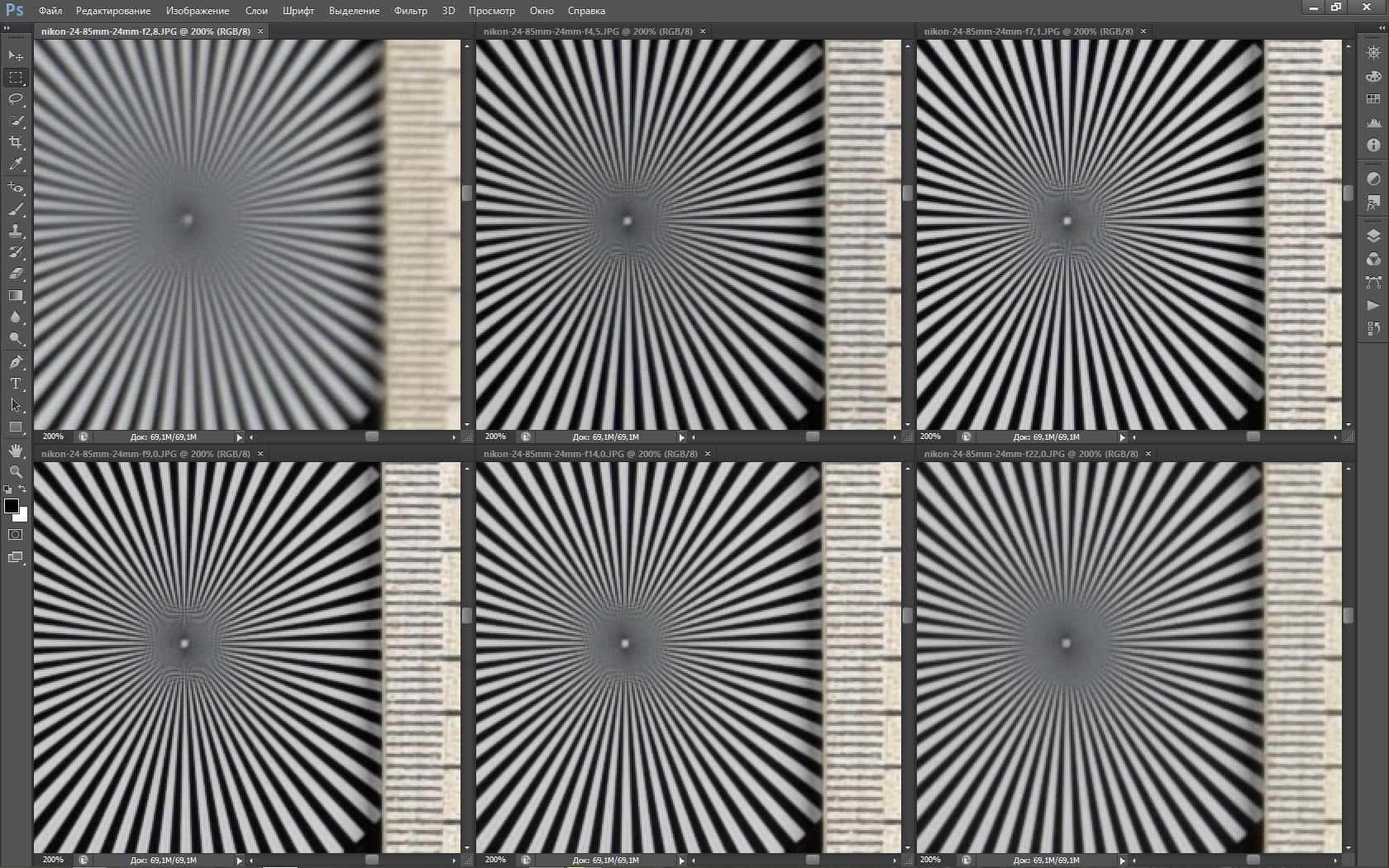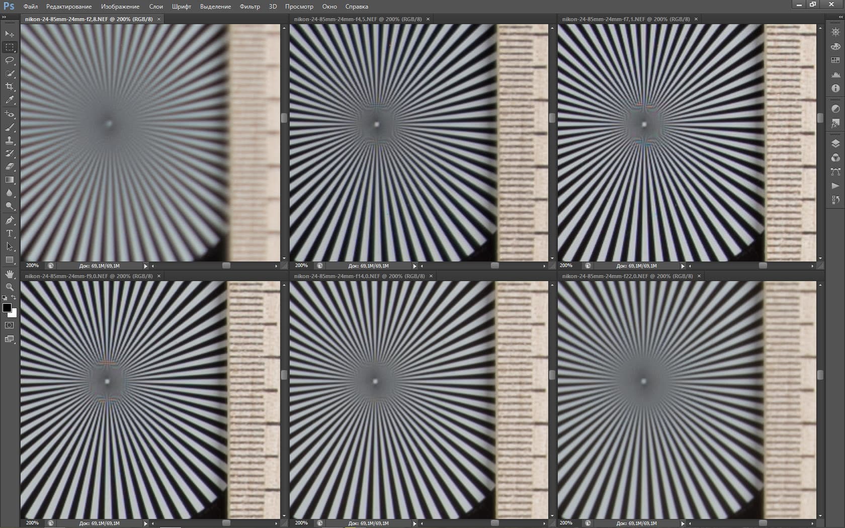 На «коротком» фокусе Nikon 24-85mm f/2.8-4D показывает неплохое разрешение в центре кадра — на средних диафрагмах это порядка 0,75 линии на пиксель по показаниям радиальных мир в JPG и порядка 0,8 в RAW. Но на широкой диафрагме f/2,8 разрешение падает до 0,55 линии на пиксель (это к вопросу о том, что высокая светосила у некоторых объективов реально не работает, поскольку открытая диафрагма сильно замыливает картинку).