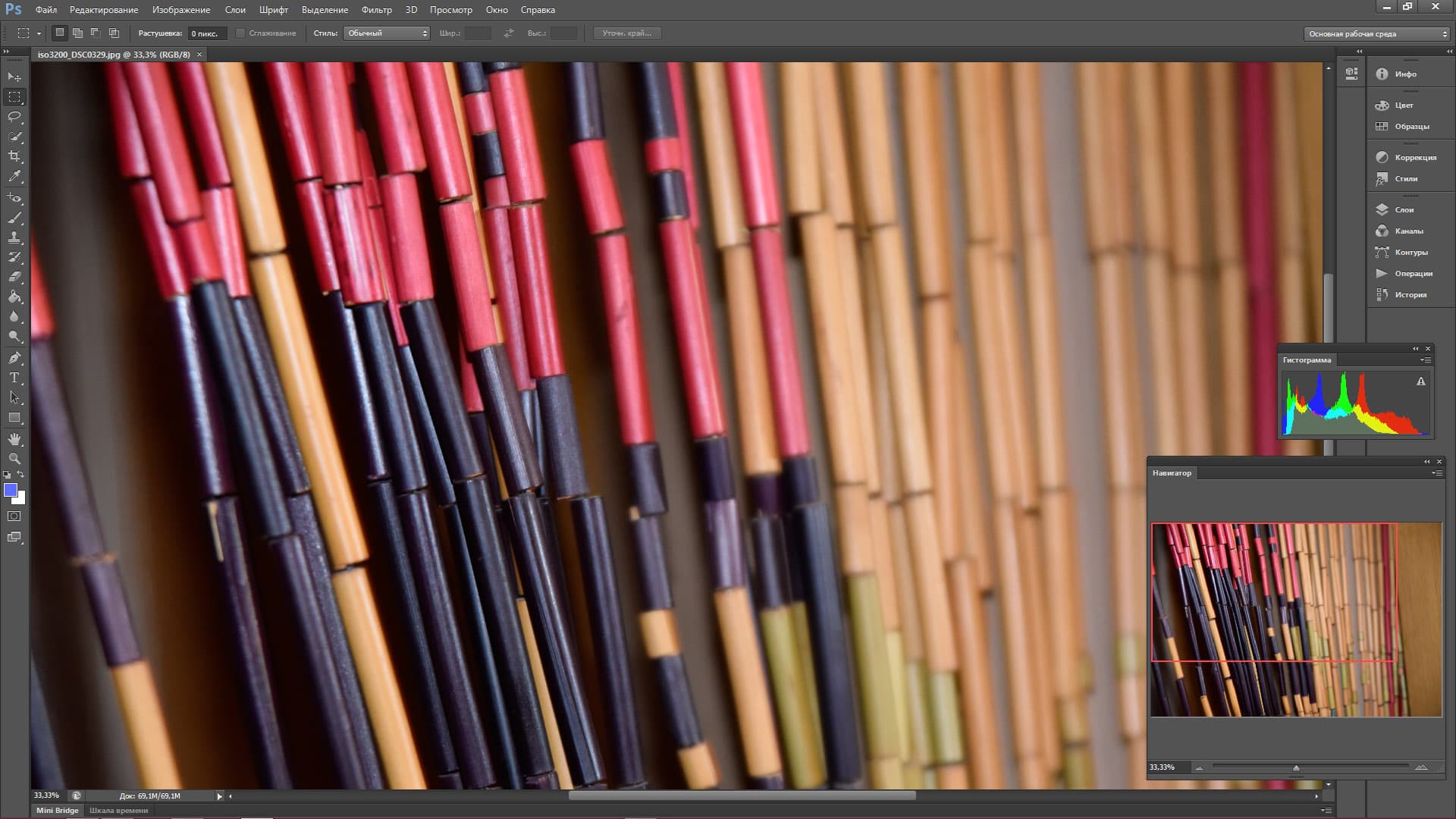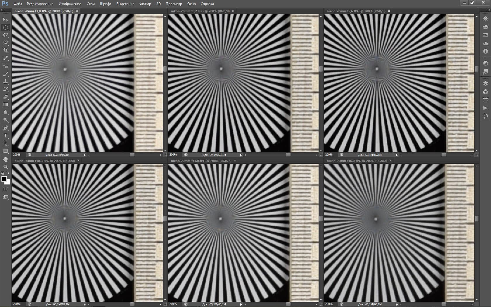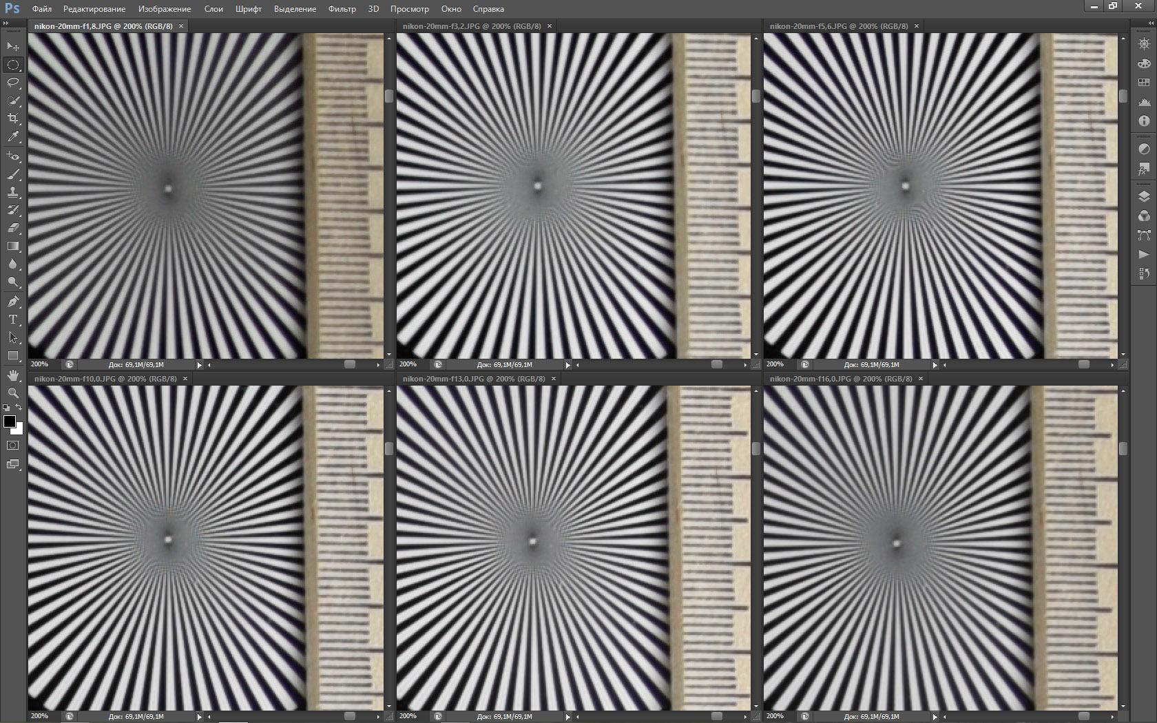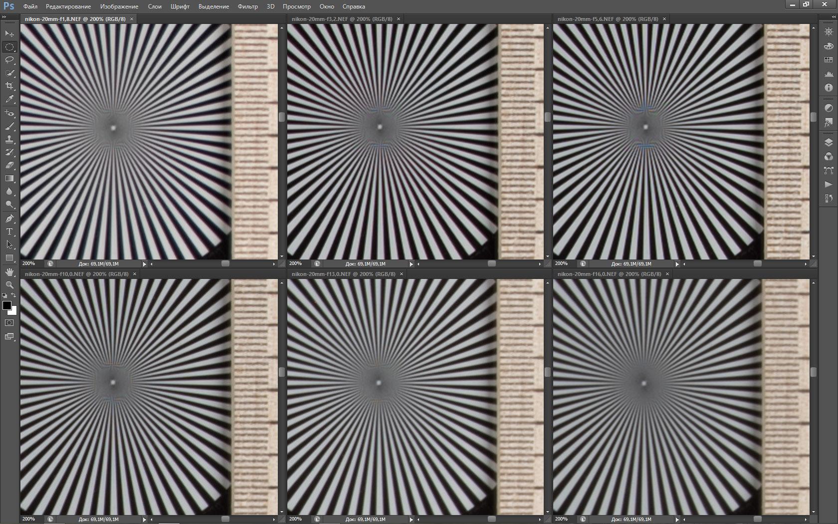 На «коротком» фокусе Nikon 24-85mm f/2.8-4D показывает неплохое разрешение в центре кадра — на средних диафрагмах это порядка 0,75 линии на пиксель по показаниям радиальных мир в JPG и порядка 0,8 в RAW. Но на широкой диафрагме f/2,8 разрешение падает до 0,55 линии на пиксель (это к вопросу о том, что высокая светосила у некоторых объективов реально не работает, поскольку открытая диафрагма сильно замыливает картинку).