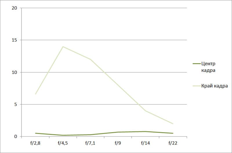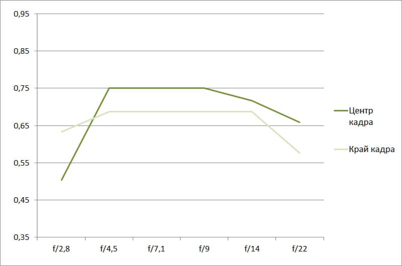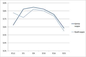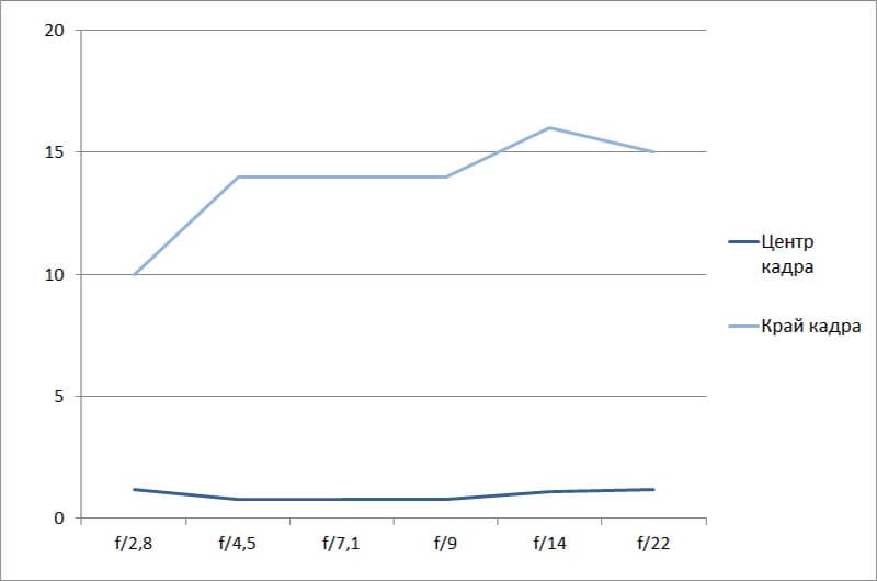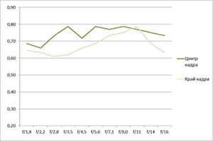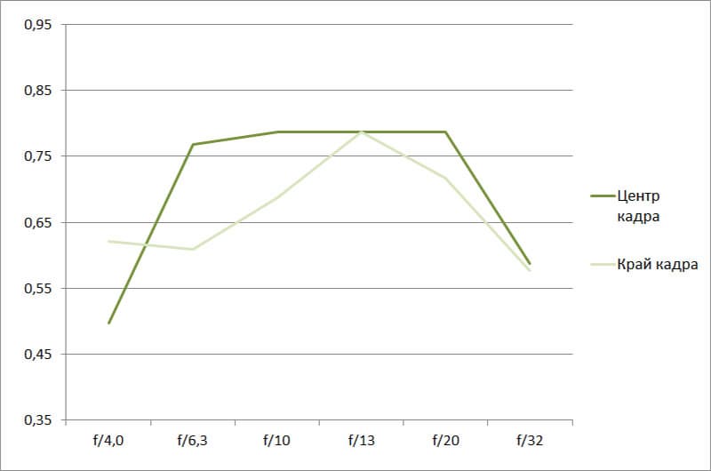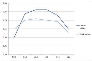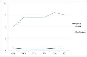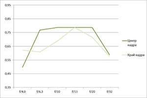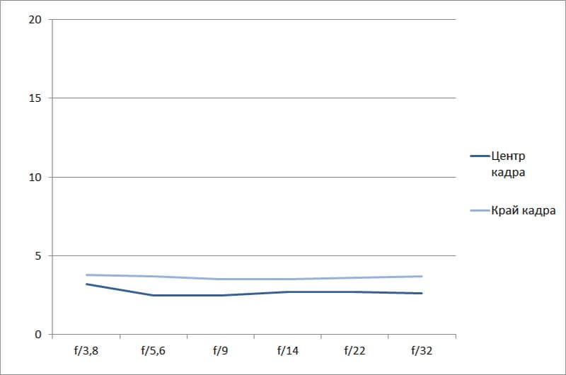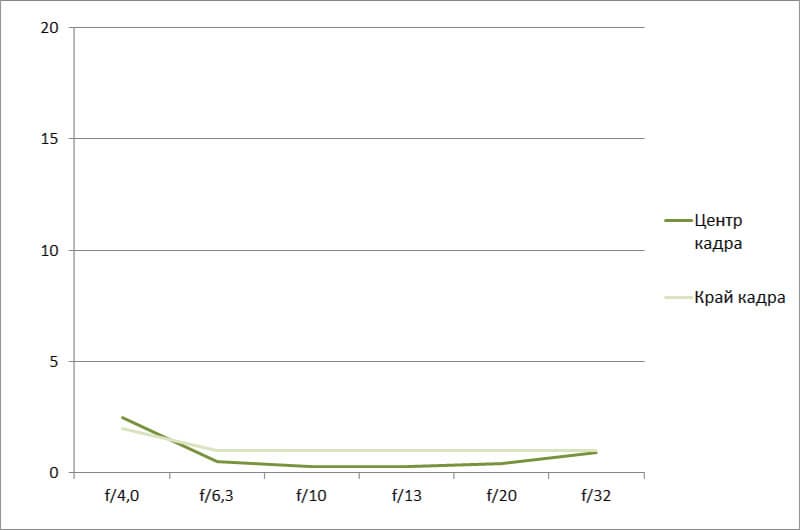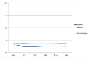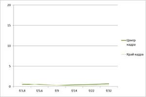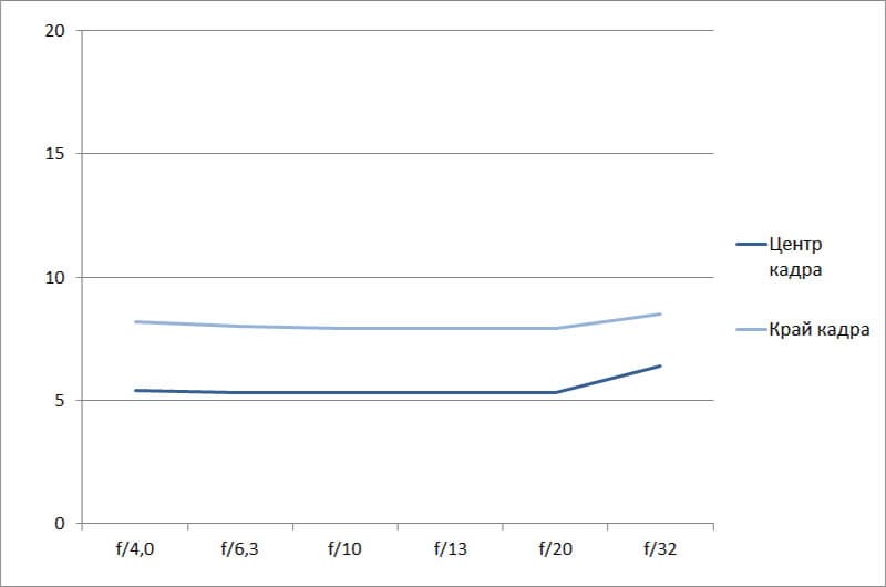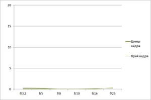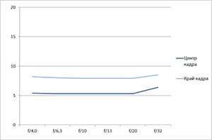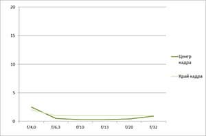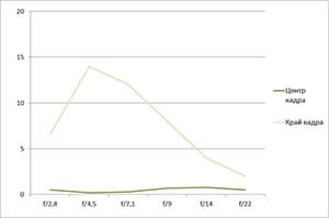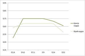 На этом фоне узкая диафрагма f/22 дает лучший результат — порядка 0,6 линии на пиксель. А край кадра во всем диапазоне отстает от центра примерно на 0,1 (это обычная картина для большинства объективов).