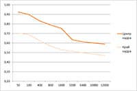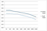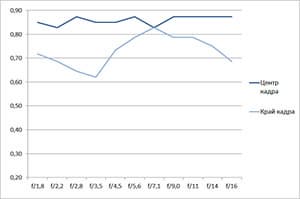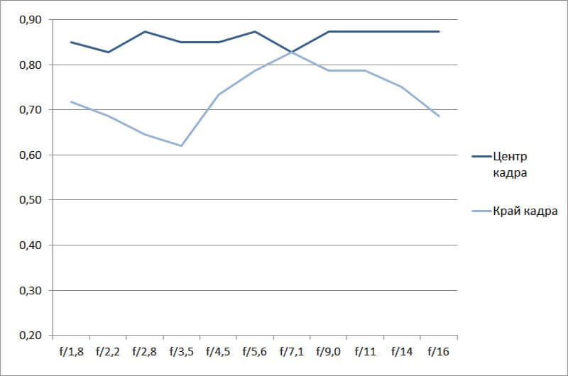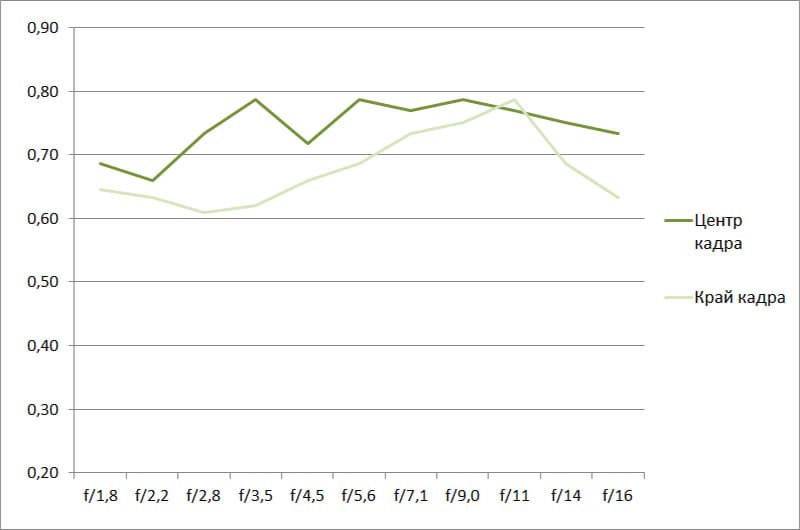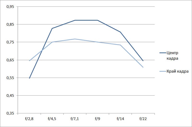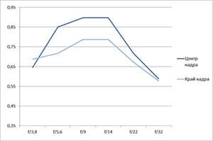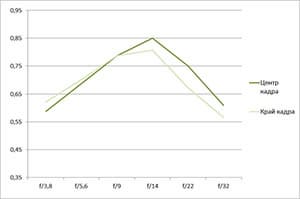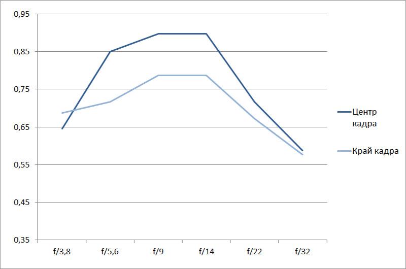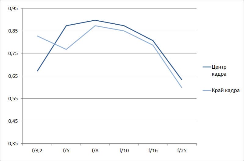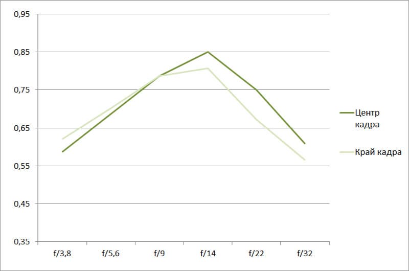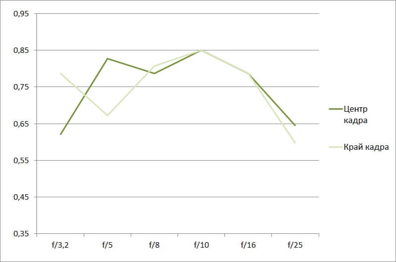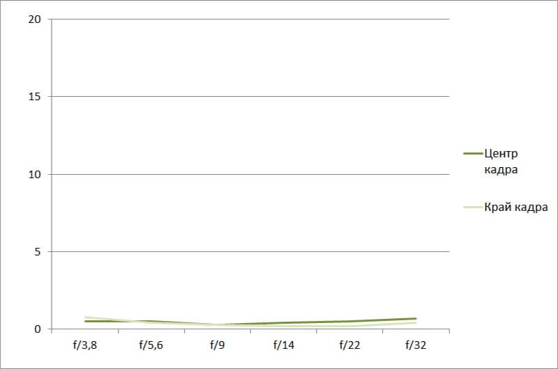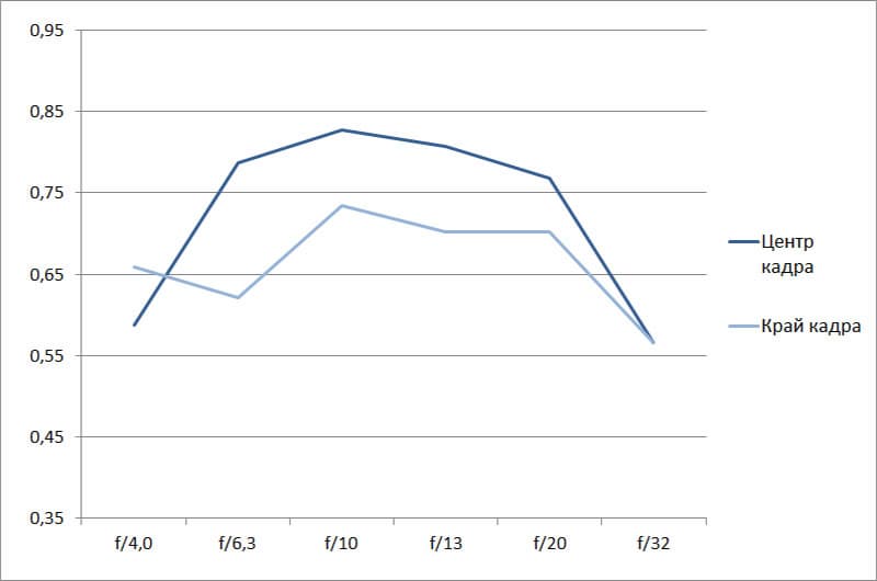 На этом фоне узкая диафрагма f/22 дает лучший результат — порядка 0,6 линии на пиксель. А край кадра во всем диапазоне отстает от центра примерно на 0,1 (это обычная картина для большинства объективов).