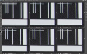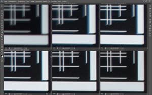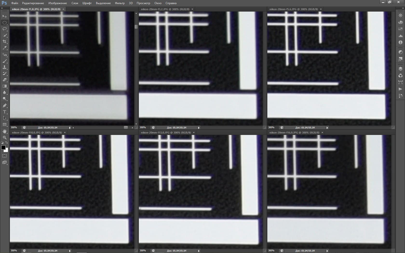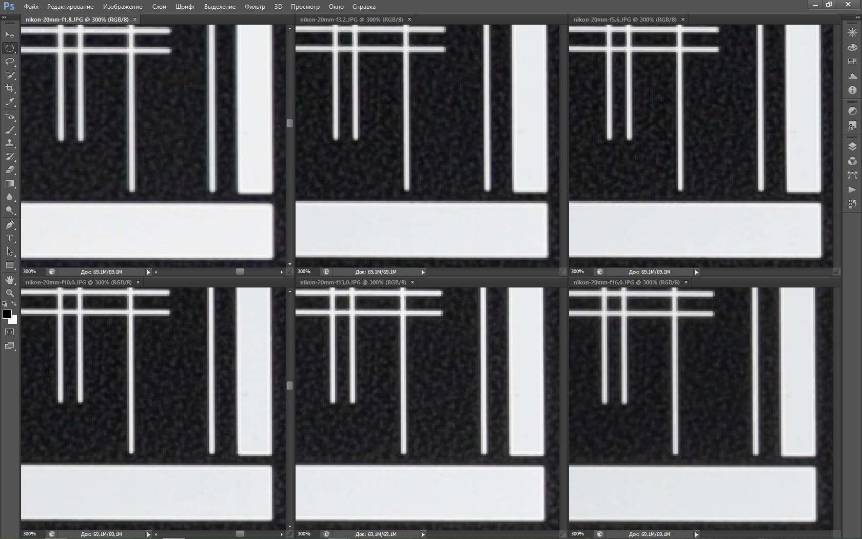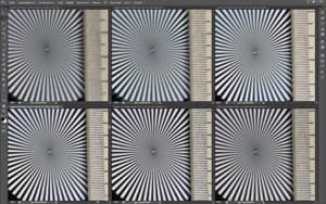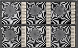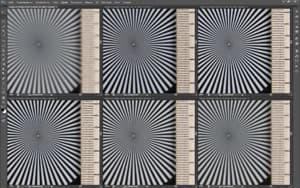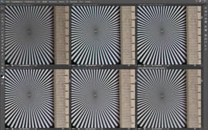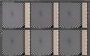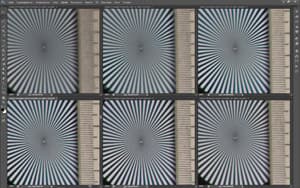 - При открытой диафрагме разрешение падает ниже 0,65 линии на пиксель. Изображение очевидно замыливается. Особенно сильно этот эффект проявляется на краях — на коротком и на длинном фокусном расстоянии