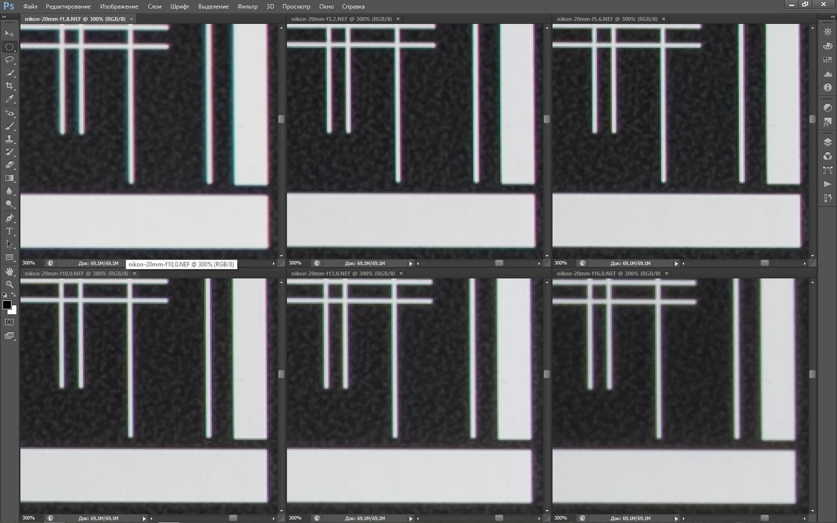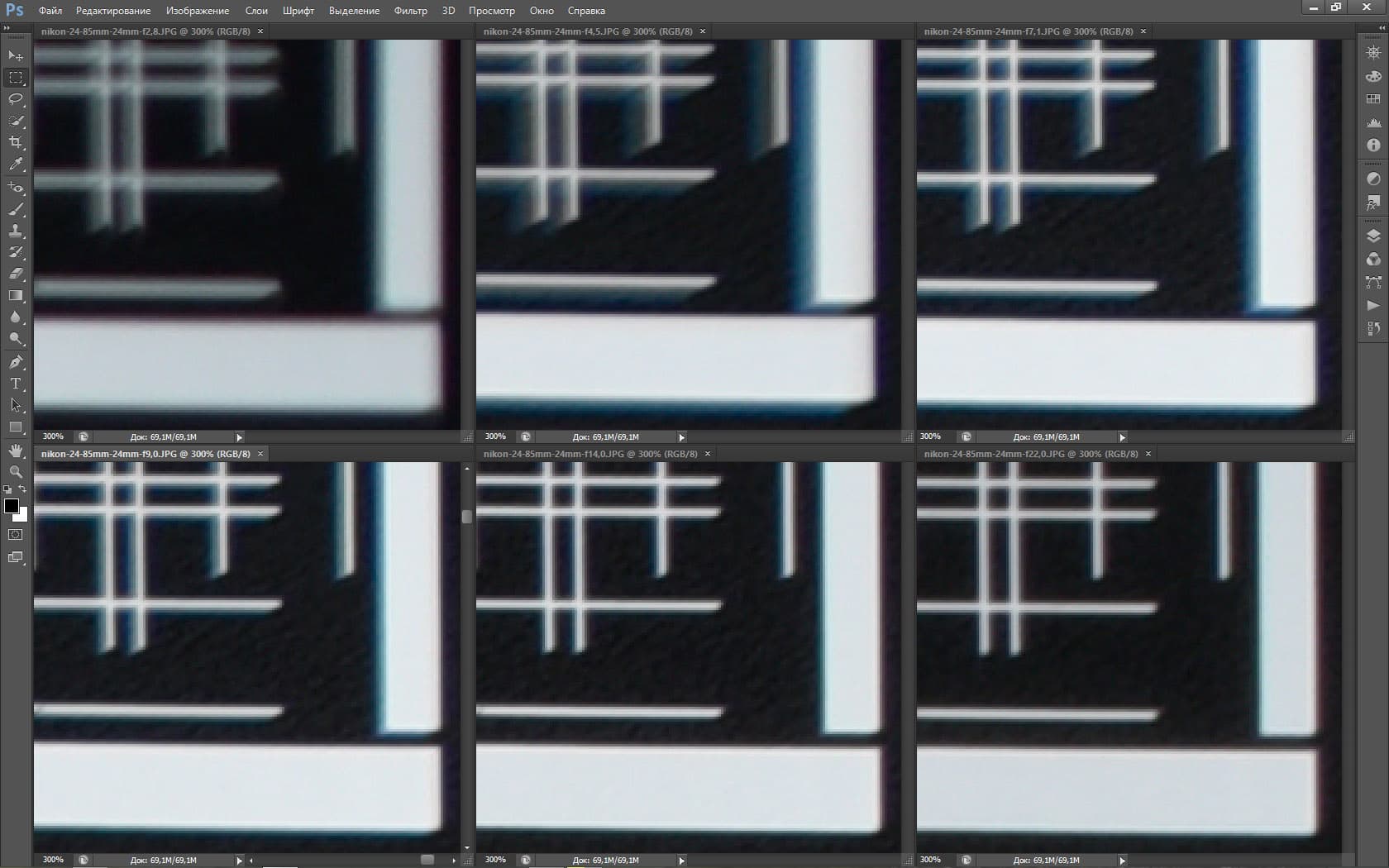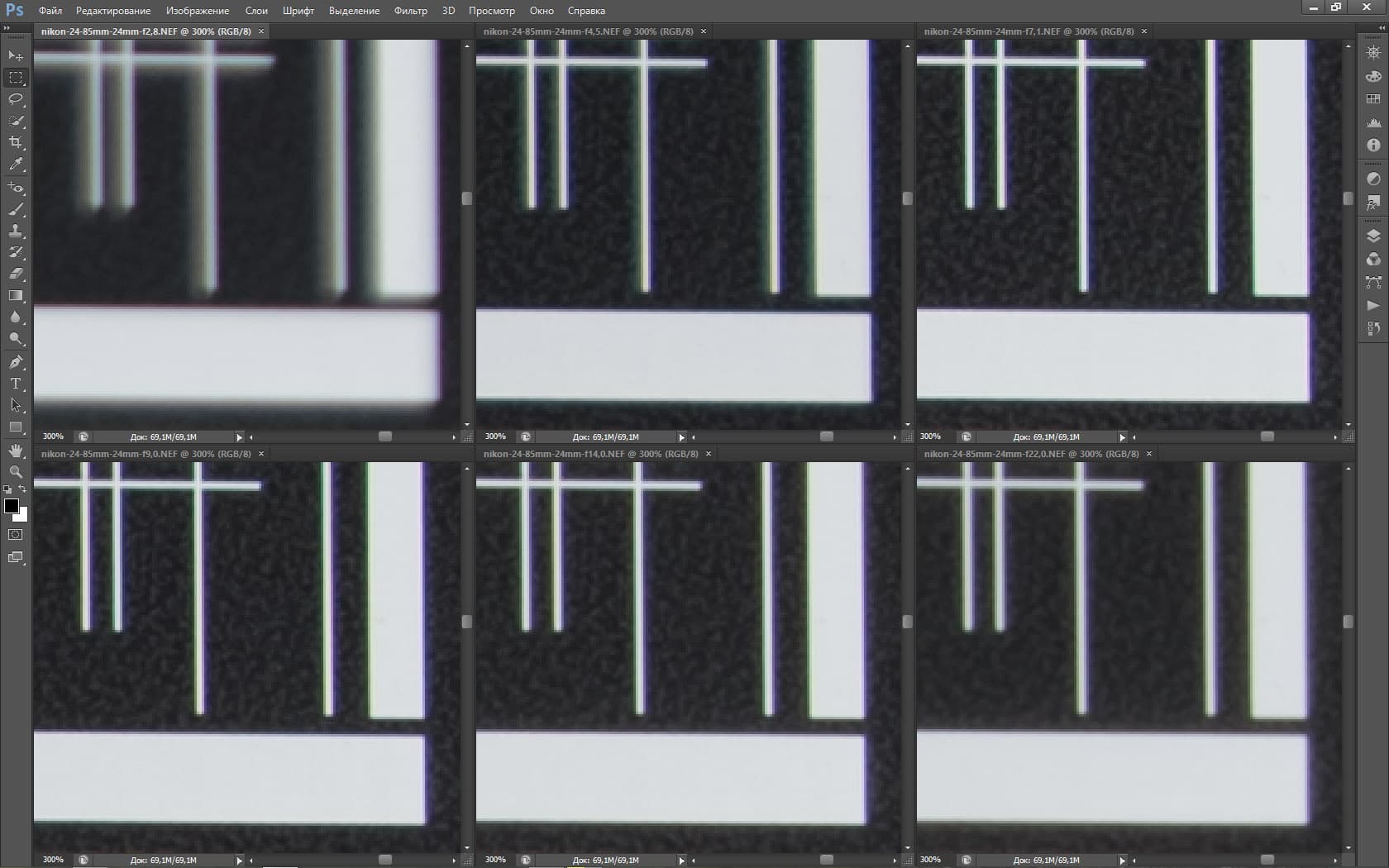 | Nikon 24-85mm f/2.8-4D IF AF Zoom-Nikkor ЭФР = ФР = 62 мм уровень хроматических аберраций на разных диафрагмах | |