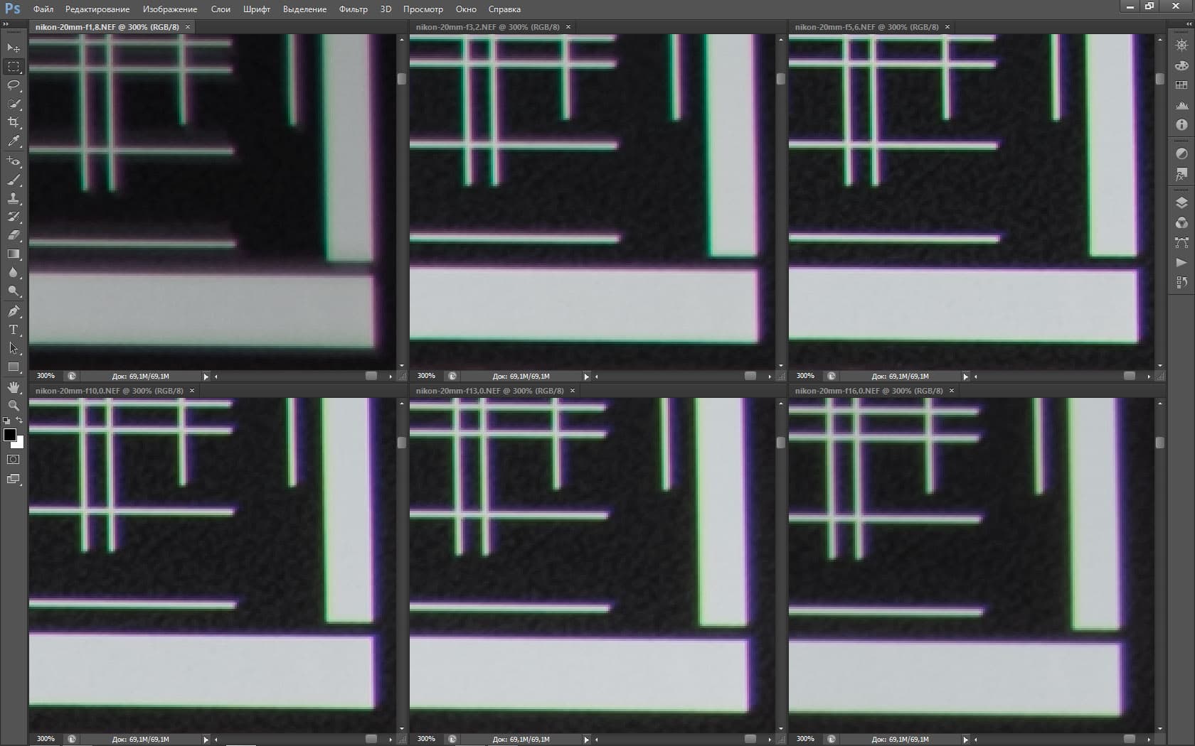 Даже поверхностного взгляда на семплы в этой таблице достаточно, чтобы заметить, что на краю кадра хроматика в RAW отличается от хроматики в JPG и по цветам, и по интенсивности. Скорее всего, при формировании JPG хроматические аберрации подавляются. Причем довольно удачно на средних и узких диафрагмах, и относительно неудачно — на широких.