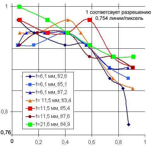По результатам съемки были построены графики разрешения по полю кадра для различных диафрагм и фокусных расстояний. По вертикальной оси — относительное разрешения (по отношению к лучшему результату для Nikon 8400 — 0,75 линии/пиксель), по горизонтальной — расстояние от центра кадра вдоль диагонали (единица измерения — полудиагональ кадра). Графики нельзя рассматривать как функции MTF, критерием для построения которых является контраст, а не визуальная оценка разрешения. Кроме того, точки на графике получены по результатам одиночных измерений, статистическая обработка не производилась. Так что кривые лишь условно иллюстрируют зависимость разрешения от положения точки измерения на кадре, фокусного расстояния и диафрагмы.