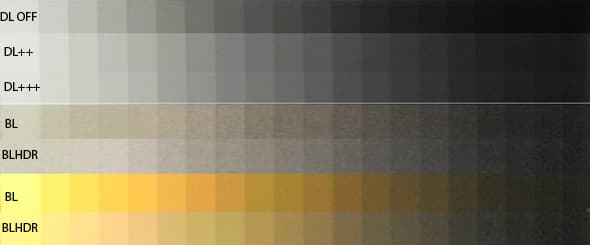 Фрагменты серого клина шкалы Kodak Q13, полученные в разных режимах улучшения передачи контраста.