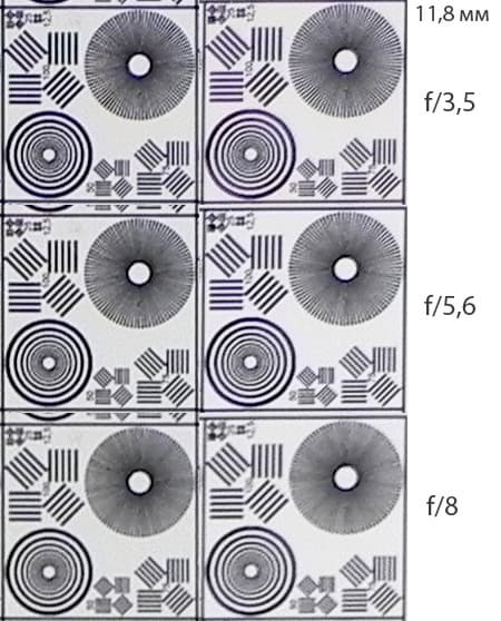 Фрагменты 1:1 снимков миры, сделанных при разных значениях диафрагмы и фокусном расстоянии 11,8 мм (экв. 66 мм). Слева фрагмент для центра кадра, справа — для правого верхнего края. Исправление искажений включено.