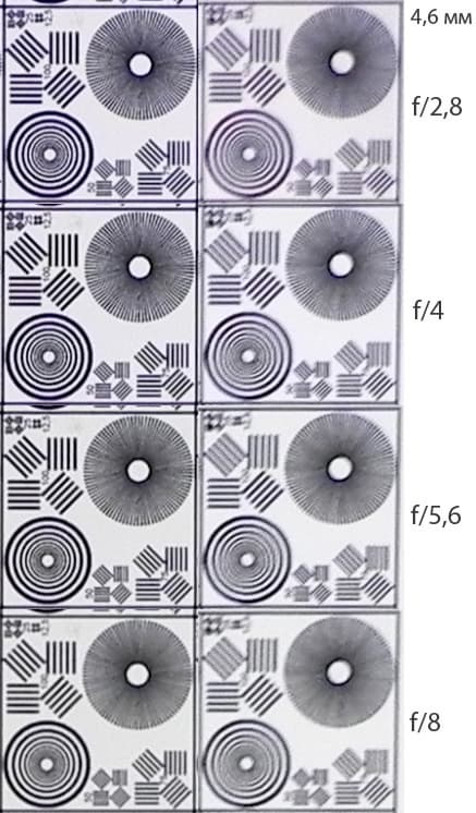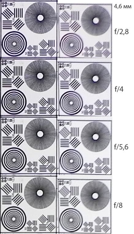 Фрагменты 1:1 снимков миры, сделанных при разных значениях диафрагмы и фокусном расстоянии 4,6 мм (экв. 26 мм). Слева фрагмент для центра кадра, справа — для правого верхнего края. Исправление искажений включено.