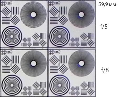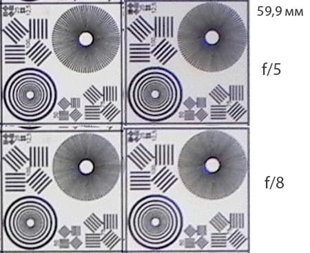 Фрагменты 1:1 снимков миры, сделанных при разных значениях диафрагмы и фокусном расстоянии 59,9 мм (экв. 337 мм). Слева фрагмент для центра кадра, справа — для правого верхнего края. Исправление искажений включено.
