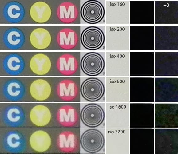 Фрагменты снимков 1:1 шкалы Kodak Q13, кольцевой миры и мишени с минимальным отражением (черное поле). Приведена серия для разных значений светочувствительности. Справа от черного поля приведены его же фрагменты после повышения яркости на 3 ступени (операция уровни+3). Съемка выполнялась при освещении мишеней лампами дневного света. Настройка баланса белого по серой карте. Выдержки короткие.