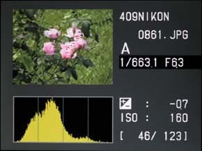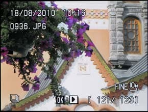 Кнопка слева от электронного видоискателя переключает сигнал дисплей/видоискатель. Отмечу, что электронный видоискатель удобен и оставляет впечатление большого масштаба обзора и хорошей детализации, хотя у него всего 230000 элементов. Справа от видоискателя кнопка режимов работы видоискателя/дисплея (картинка с информацией и без, экранная сетка с информацией — как уже отмечалось, гистограммы при съемке нет). Следующая кнопка — для видеозаписи, с селектором режима работы (HD — видео высокого разрешения, до 1080p; HS — видео с высокой и изменяемой в процессе съемки скоростью, максимальная частота 240 к/с при 320×240 и 120 при 640×480). Справа вверху — диск управления. Справа от дисплея — мультиселектор навигации по меню и управления: вспышкой, таймером, фокусировкой (автофокус, макро, ландшафтная съемка, ручная фокусировка), экспокоррекцией. Рядом с мультиселектором — кнопки просмотра, вызова меню и удаления снимков.