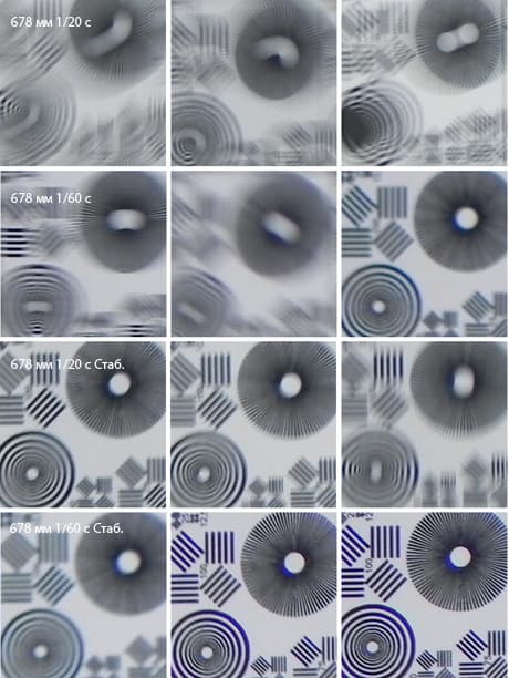 Фрагменты в масштабе 1:2 для оценки эффективности системы стабилизации. В каждом горизонтальном ряду три фрагмента трех снимков, сделанных с указанной для ряда выдержкой с рук. Можно заключить, что стабилизация дает не больше трех ступеней запаса по выдержке.