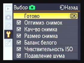 Варианты оптимизации изображения для JPEG файлов, вложенное подменю для «Меню съемки»/ «Оптимизировать снимок». |