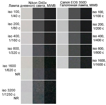 Съемка мишени для оценки шума производилась при освещении лампами дневного света. Установка баланса белого — по серой мишени (MWB). Приведены фрагменты серых полей мишени в масштабе 1:1 для камер Nikon D40x и Canon 350D . При большИх значениях светочувствительности (больше 400 единиц) может быть включено шумоподавление. Для ISO 1600 и HI (3200) приведены фрагменты снимков, сделанных с включенным шумоподавлением и без него.