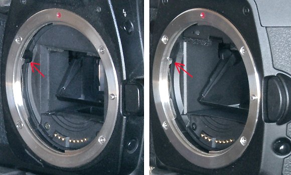 Слева Canon D60, справа Canon 5D. Обращаю внимание на места, помеченные стрелками. У 5D отсутствует механический выключатель электрической системы сопряжения с объективом.