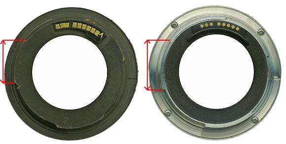Переходное кольцо с байонета EOS на М42 фирмы Поиск-Фото с наклеенным «Одуванчиком» и удлинительное кольцо для макросъемки. Стрелками отмечены лепестки байонета разной длины.