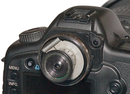Лупа фирмы Pentacon, предназначенная для дополнительного 2,7-кратного увеличения центральной части изображения в видоскателе, установленная на камеру Canon EOS 5D.