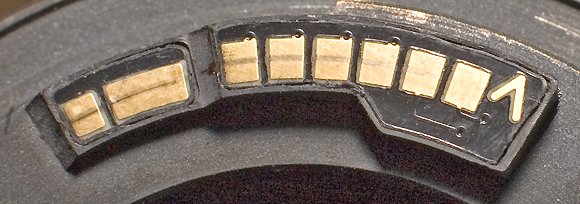 «Одуванчик» представляет собой пластмассовую пластинку с группой контактов, которая, будучи наклеена на переходное кольцо, сообщает камере значения фокусного расстояния и диафрагмы. Эти значения могут быть запрограммированы самыми разными. По умолчанию, фокусное расстояние — 55 мм и относительное отверстие — 1:1,4. Весьма вероятно, что объектив, который будет ввернут в переходное кольцо, имеет совсем другое фокусное расстояние и совсем иное относительное отверстие. Но это не имеет никакого значения. Наша задача — обмануть автоматику камеры. Если камера установлена в режим приоритета диафрагмы, то и система подтверждения точной фокусировки, и автоматическая установка выдержки будут работать. А в заголовке EXIF файла будут записываться именно те значения, которые зашиты в микросхему «Одуванчика». Для новых камер Canon, за исключением единичек, наличия контактов, наклеенных на переходное кольцо, уже достаточно. Для пленочных камер, цифровых камер Canon EOS D30 и D60, а также, похоже, для всех единичек, камеру надо обманывать еще и механически. Если сравнить байонет на объективе и байонет переходного кольца EOS-М42, то можно заметить, что один из лепестков байонета на переходнике уже.