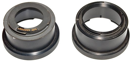 Переходное кольцо с байонета Б на Canon EOS (справа) и комбинация из двух переходных колец Б-M42 и М42-EOS.
