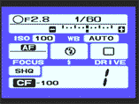 Здесь можно увидеть выдержку, чувствительность, состояние вспышки, экспокоррекцию, диафрагму, диапазон фокусировки. А в случае ручной фокусировки — расстояния до объекта. Отметим, что расстояние до объекта измеряется от торца объектива, в отличие от пленочных камер, где расстояние измеряется от пленки.