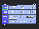 В ручном режиме вы выбираете диафрагму из тех же двух значений и выдержку 4-1/10000 с (в спецификации от 8 с, но мне удалось установить только 4).При этом шкала, которая в автоматическом режиме указывала введенную вами экспокоррекцию, здесь индицирует, насколько ваш выбор отличается от выбора автоматики камеры. Для более специфических настроек, как то одиночный кадр, серия кадров, съемка по таймеру, качество и размер кадра, баланс белого, чувствительность матрицы, быстрый фокус, вам необходимо специальной кнопкой вызвать меню на ЖК экране и, манипулируя 4-позиционной кнопкой, выбрать необходимые вам параметры.