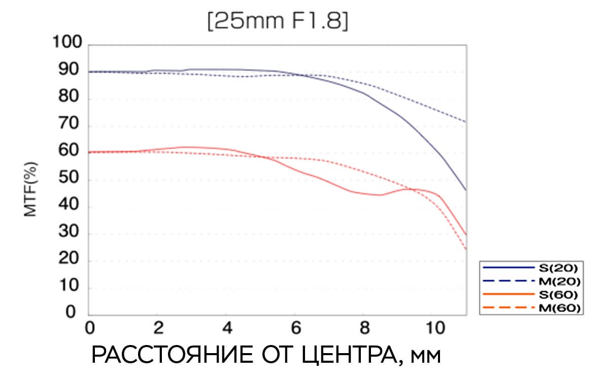 Вот как выглядит диаграмма MTF (Modular Transfer Function), или ЧКХ (частотно-контрастной характеристики), объектива (данные Olympus America). Подробно о том, как читать ЧКХ, см. на странице Владимира Медведева.