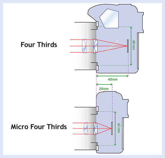 Но ведущие производители просто так не сдаются. И в сентябре 2008 года Panasonic отыгрался, выпустив «бомбу» Lumix DMC-G1, первую камеру типа MILC (mirrorless interchangeable-lens camera, беззеркальная камера со сменной оптикой) стандарта Micro Four Thirds. Пожалуй, с нее начинается эпоха «беззеркалок», поскольку ее предшественники Epson R-D1 (2004 год) и Leica M8 (2006 год) были, скорее, имиджевыми моделями и не завоевали широкий рынок. И вместе с Lumix DMC-G1 на арену выходит дитя сотрудничества Olympus и Panasonic — стандарт Micro Four Thirds, нацеленный на укороченное рабочее пространство камеры (без зеркала). При этом параметры сенсора остаются прежними, как у «большой» Four Thirds System — матрица с размерами рабочей части 17,3 × 13 мм (диагональ 21,6 мм), соотношение сторон — 4:3, кроп-фактор — 2,0.