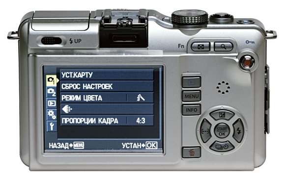 Управление камерой выполнено в стиле компактных камер, т. е. используются кнопки, а не колеса прокрутки для выбора параметров. Это менее оперативно для тех, кто привык устанавливать все параметры самостоятельно, но некритично для тех, кто привык полагаться на автоматику. А именно на них и рассчитана эта младшая модель. Два колеса прокрутки присутствуют в старшей модели Р2, одно есть в новой E-PL2. Тем не менее, иерархическое меню очень богатое и обеспечивает полный доступ к настройкам. Отмечу, возможности настройки через меню существенно богаче, чем у Sony NEX. И это еще раз подтверждает мой тезис о том, что камера micro 4/3 по функциональности вполне готова конкурировать с зеркальными камерами среднего уровня.