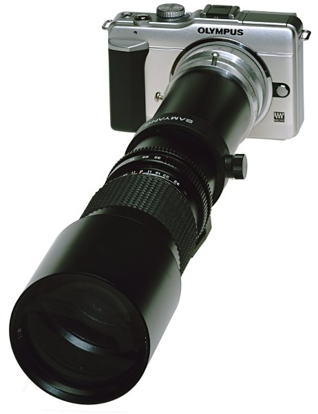 Для астрономических снимков лучше подходят зеркально-линзовые объективы, и их вполне реально использовать с Pen E-PL1. Широкое переходное кольцо на объективы с резьбой М42 позволяет легко захватить его хомутом для надежного крепления объектива на штативе, даже если, как в случае с объективом Рубинар, подобное крепление не предусмотрено конструкцией.