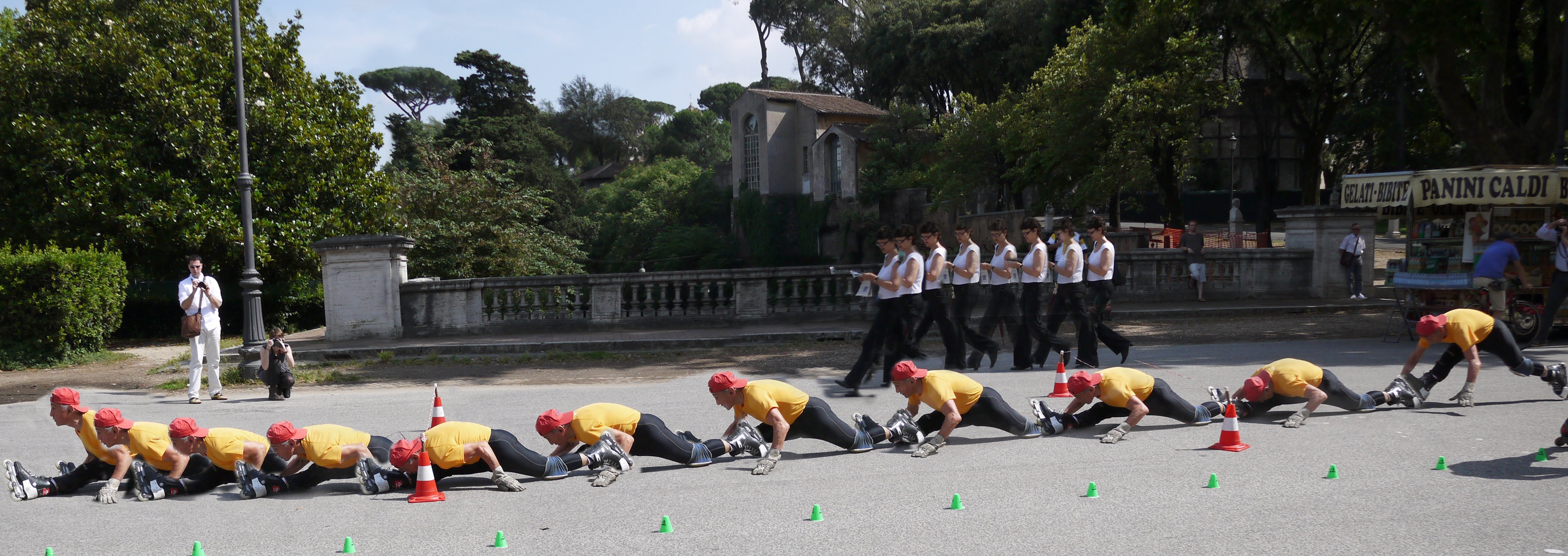 Для того, чтобы журналисты могли ощутить лёгкость и удобство камеры, фирма Panasonic организовала 4-часовую пробежку по Риму с двумя спецучастками. Первый спецучасток был посвящён скоростной спортивной съёмке. Асы роликовых коньков демонстрировали свои трюки, а мы пытались выяснить, сколь адекватно снимки камеры способны отразить эти трюки.