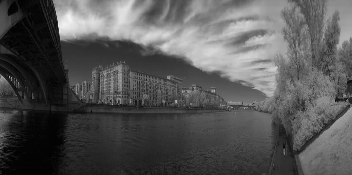 Вид на Фрунзенскую набережную. Зенитар. Черно-белое изображение без фильтра.
