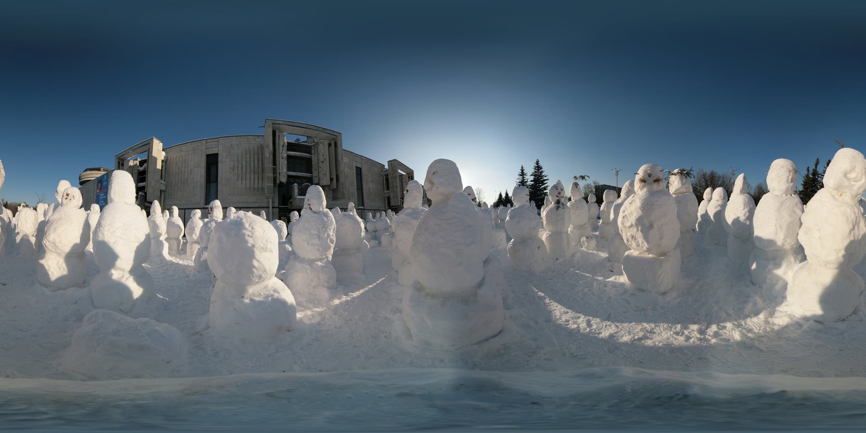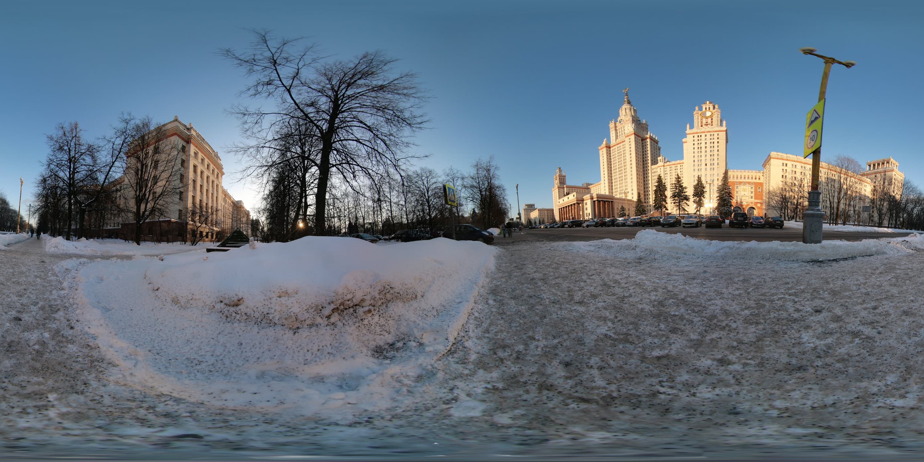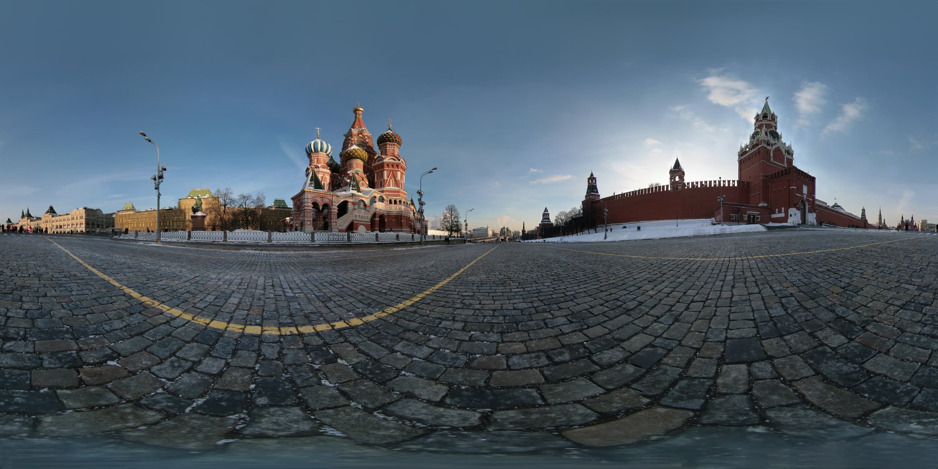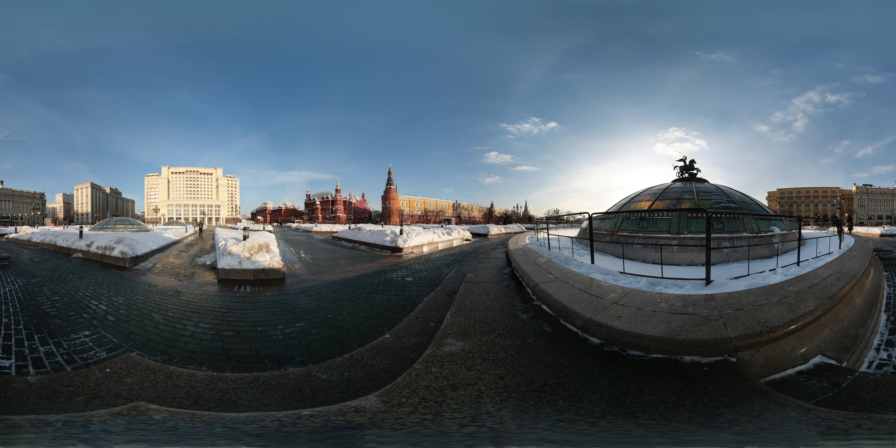 Ниже приведены ссылки на несколько сферических панорам, снятых в течение одной прогулки по Москве. Для представления панорам используется PTViewer. Для экономии трафика представленные панорамы имеют половинный размер от полученного в результате сшивки. Панорамы в эквидистантной проекции можно скачать и просматривать на локальной машине с помощью программы Panini. Среди многих любопытных возможностей данной программы мне особо нравится плавно менять проекцию движением мыши по картинке от прямолинейной до рыбьего глаза.