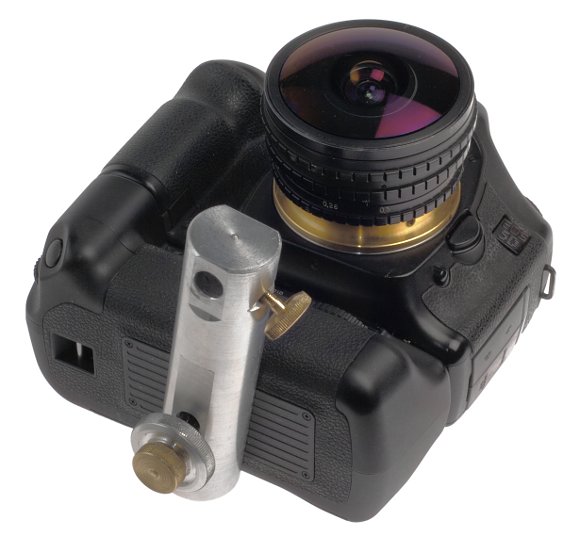 К нему был прикручен двухсекционный поясной, опять же советский, монопод. Сверху к нему вместо штативной головки был прикручен специально выточенный штырь диаметром 10 мм. К камере была прикручена штанга, имевшая дырку диаметром 10 мм, расположенную под передней линзой объектива. Если рельеф местности не требует поднимать камеру над поверхностью, то можно обойтись и без монопода, прикрутив штырь прямо к штативу.